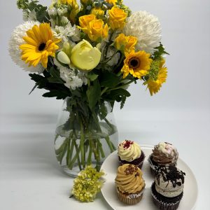 Lemon Bouquet in Glass Vase & 4 x Asst. Cupcakes