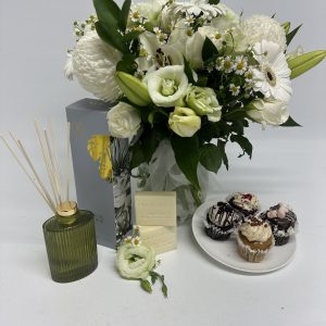 • aWhite Bouquet in Glass Vase & 4 x Asst. Cupcakes