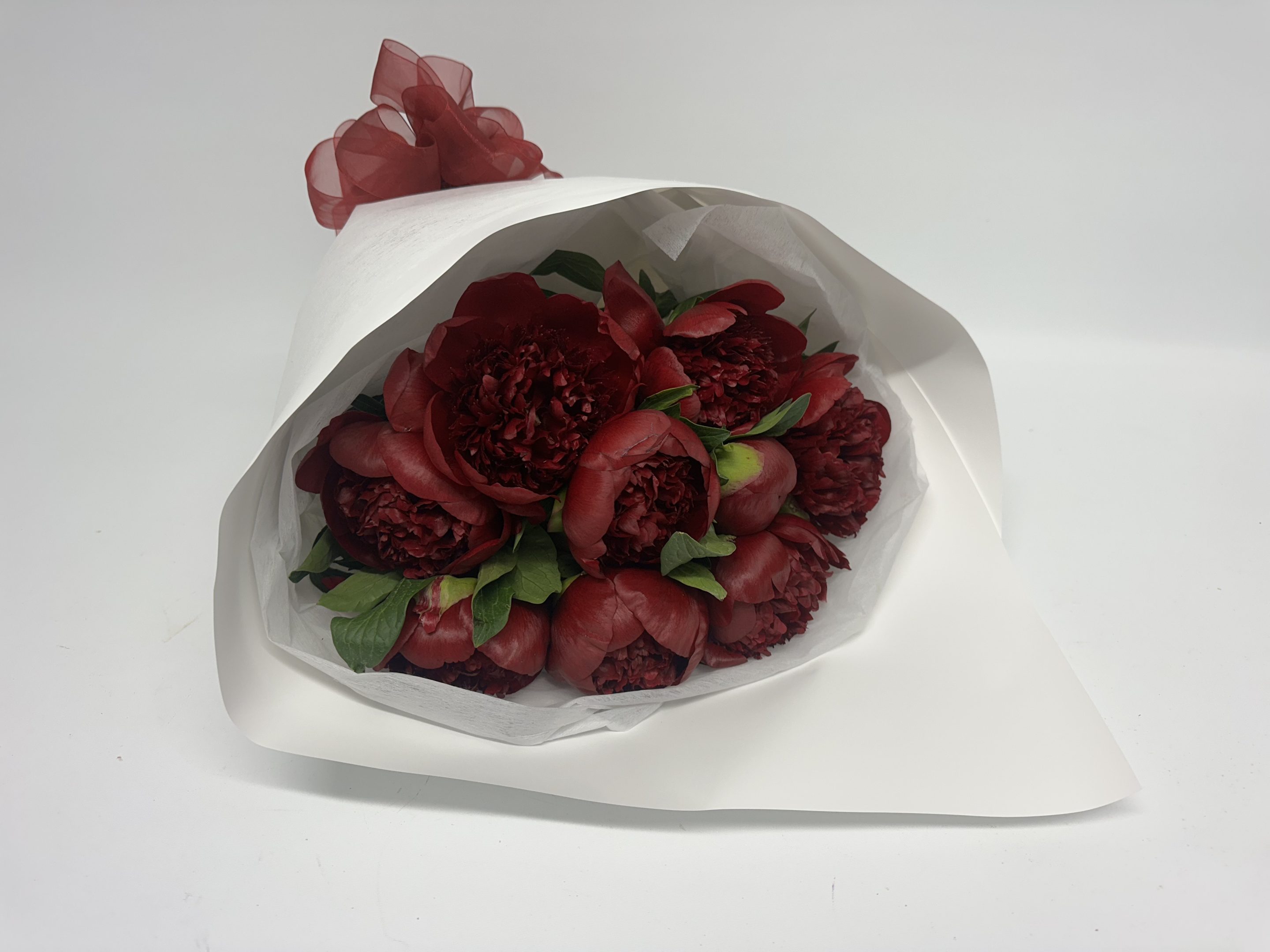 10 Stems of  Red Charm Peonies   wrapped in white paper with a wet wrap to keep flowers fresh on delivery, the Peony are grown in the South Island of New Zealand only ,with it’s gorgeous lush bloom and delicate scent, so very special and an absolute favourite flower to many due to their short season.