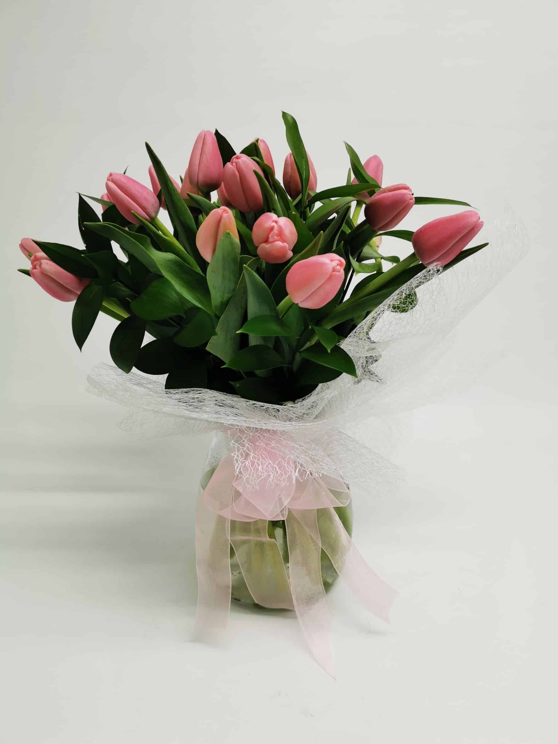 Send something beautifully unique with this stunning gift set featuring 20 fresh tulip stems paired with a stylish quality glass vase. Tulips are a special seasonal flower and are delivered in bud form so they last longer and can be enjoyed for days to come. This gift is perfectly complemented with a box of Lindor Chocolates 125g. Arranged in a classic posy style and presented in a white carry bag with a water-filled container to keep the flowers fresh.