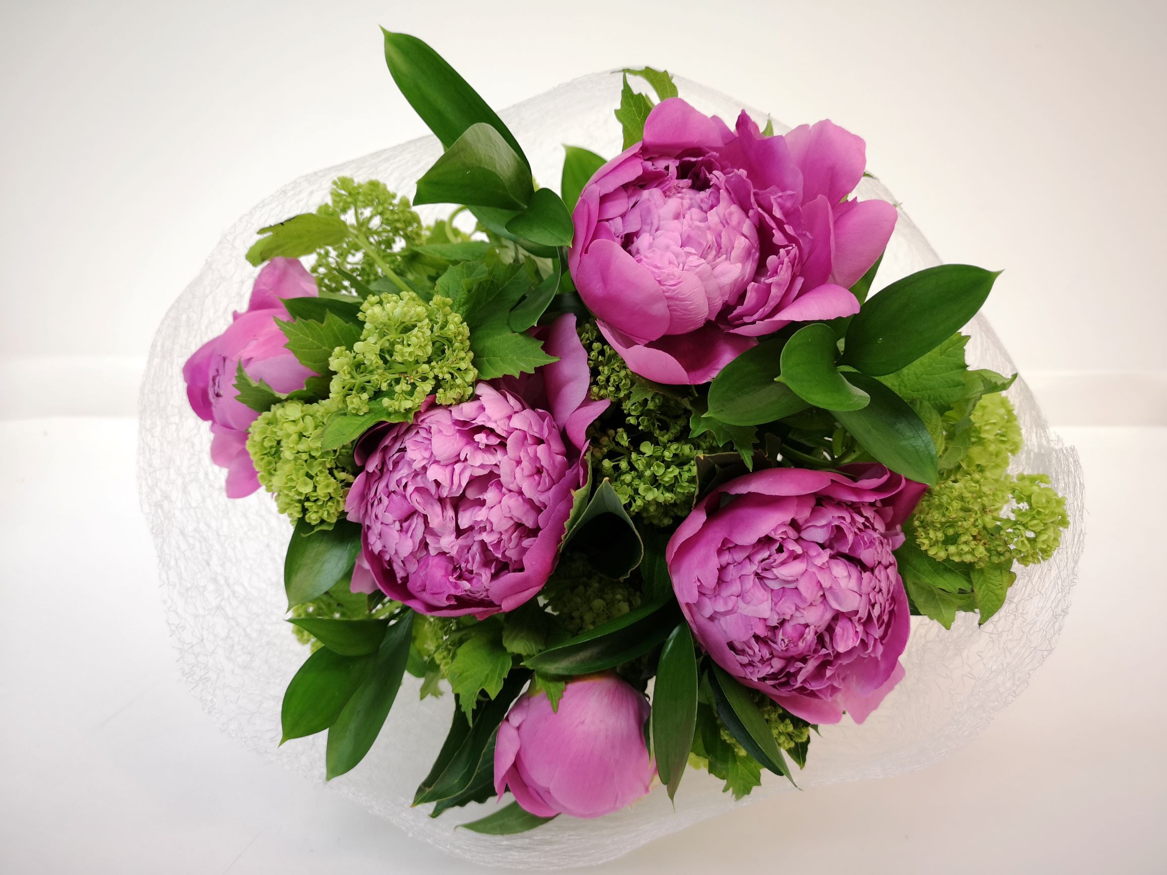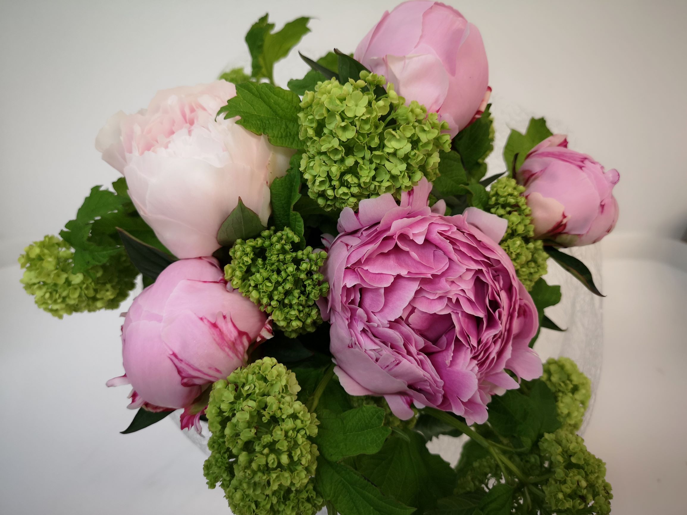 The pink Peonies in a bouquet arranged with greenery wrapped in white paper with a wet wrap to keep flowers fresh on delivery, the Peony are grown in the South Island of New Zealand only ,with it’s gorgeous lush bloom and delicate scent, so very special and an absolute favourite flower to many due to their short season.