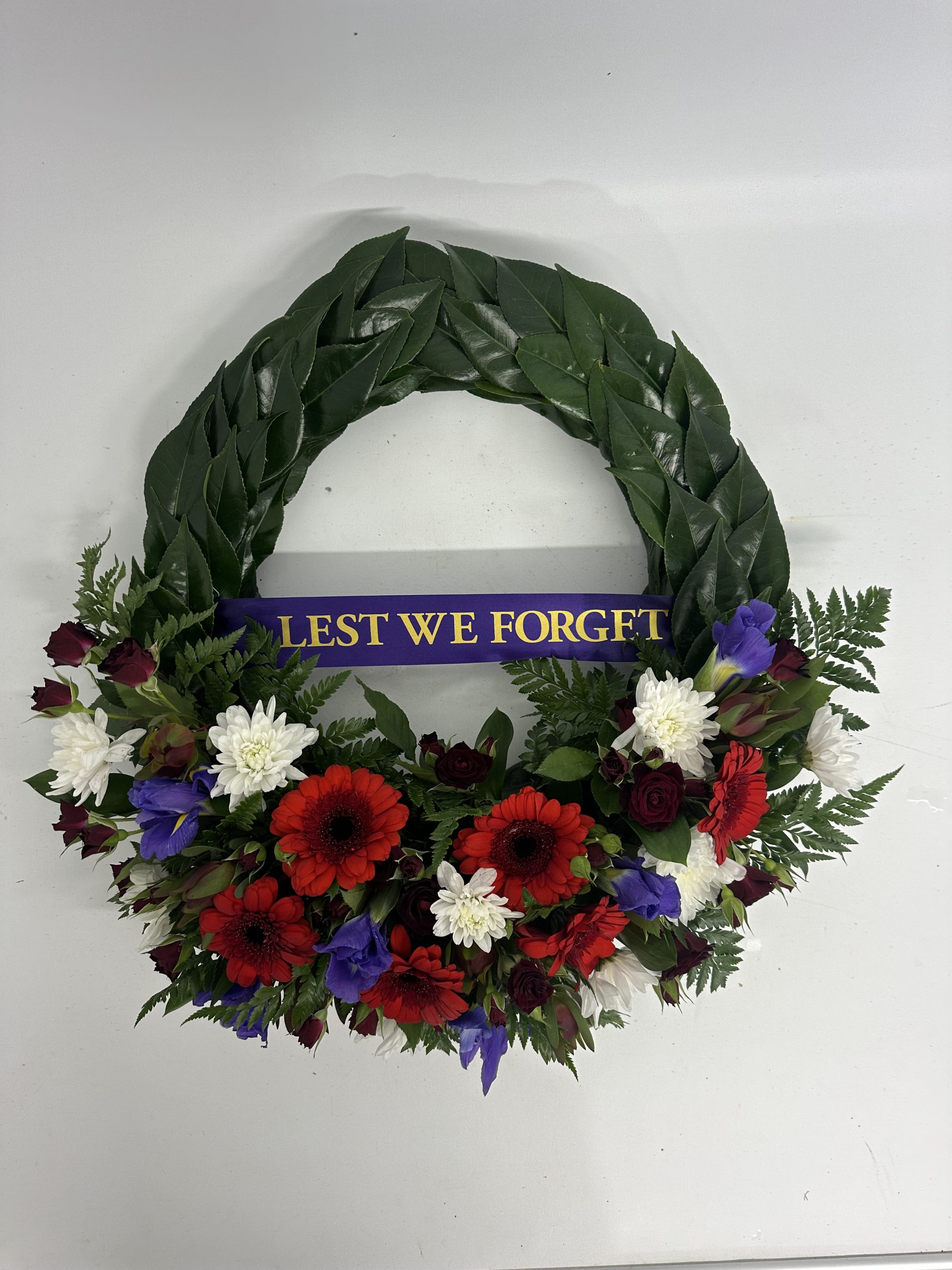 A traditional ANZAC wreath created with fresh gerberas, red roses, and other seasonal white bue red flowers. Designed in a classic round style, this wreath is ideal for ANZAC Day services, wreath laying, and memorial ceremonies.