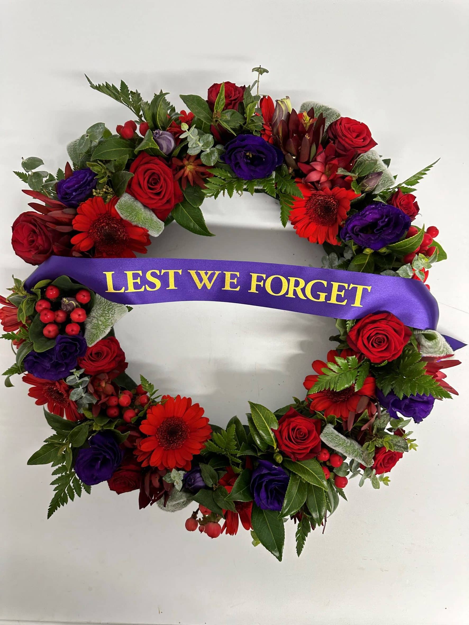 A traditional ANZAC wreath created with fresh seasonal red and purple flowers, complemented with greenery and a Lest We Forget ribbon. Designed in a classic round style, this wreath is suitable for ANZAC Day services, wreath laying, and memorial ceremonies. Bulk order pricing is available for delivery to one address.