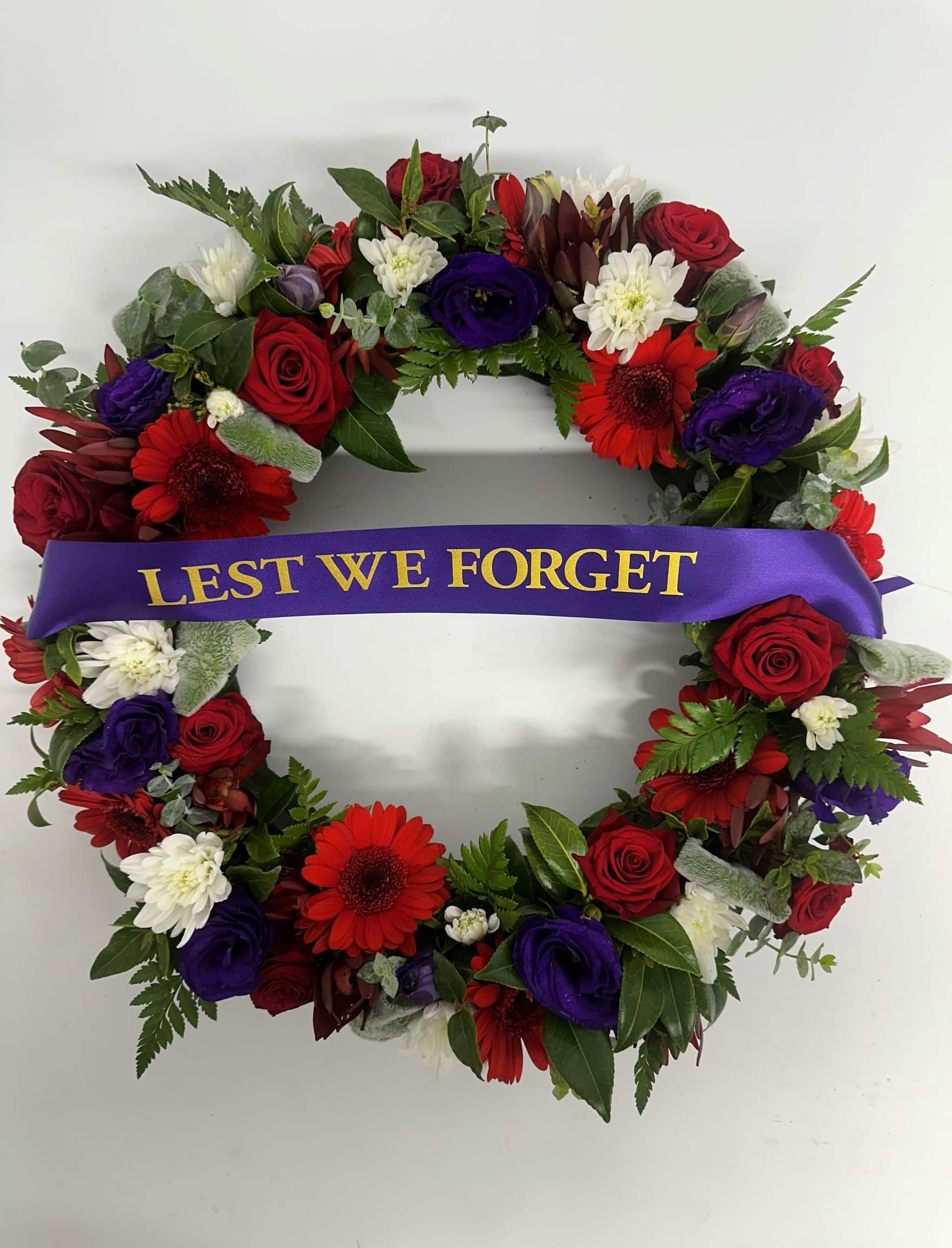 A traditional ANZAC wreath created with fresh seasonal red, purple, and white flowers, complemented with greenery and a Lest We Forget ribbon. Designed in a classic round style, this wreath is suitable for ANZAC Day services, wreath laying, and memorial ceremonies. Bulk order pricing is available for delivery to one address.