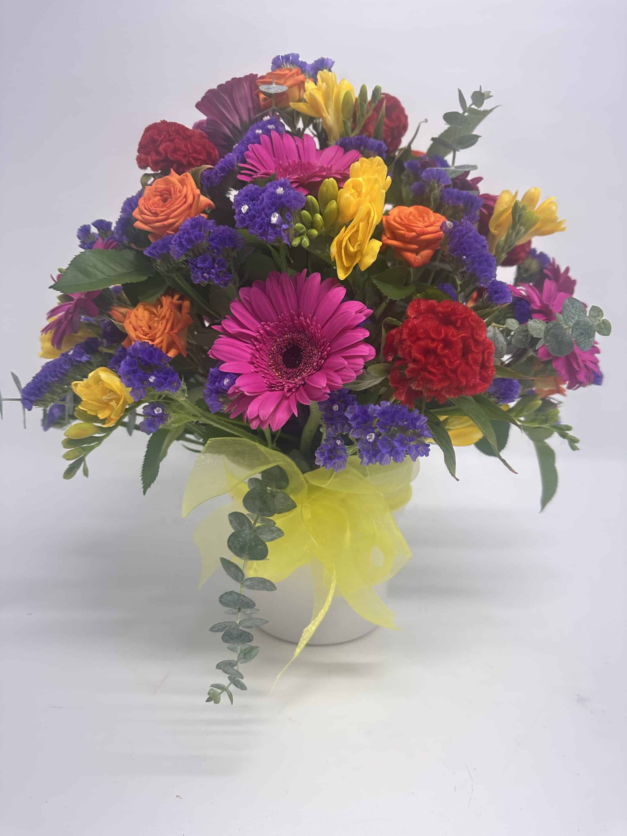 A cheerful and uplifting arrangement featuring a vibrant selection of fresh seasonal flowers. Designed in floral oasis and presented in a stylish ceramic container, this gift requires no vase and is perfect for hospitals, workplaces, or brightening someone’s day at home. A beautiful, convenient, and long-lasting option created by our professional designer.