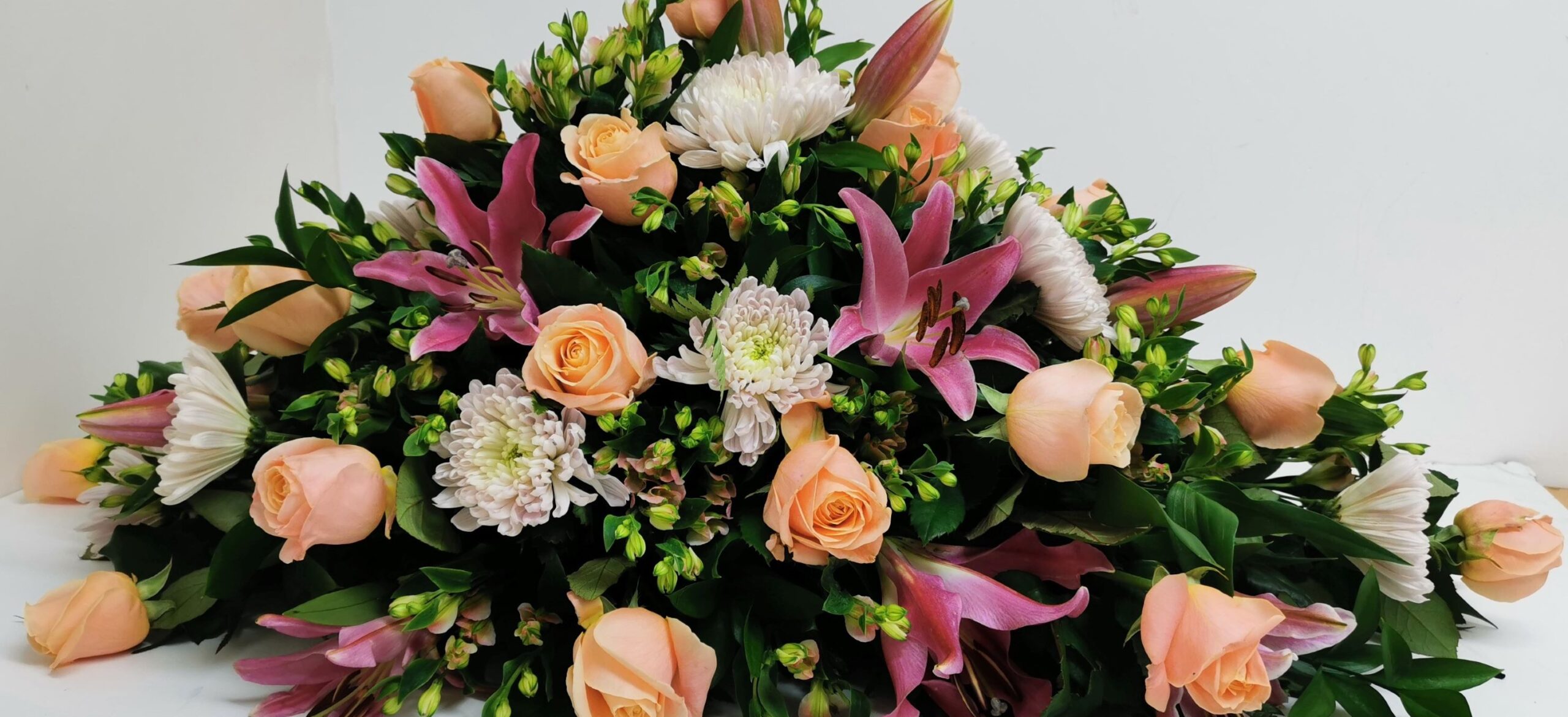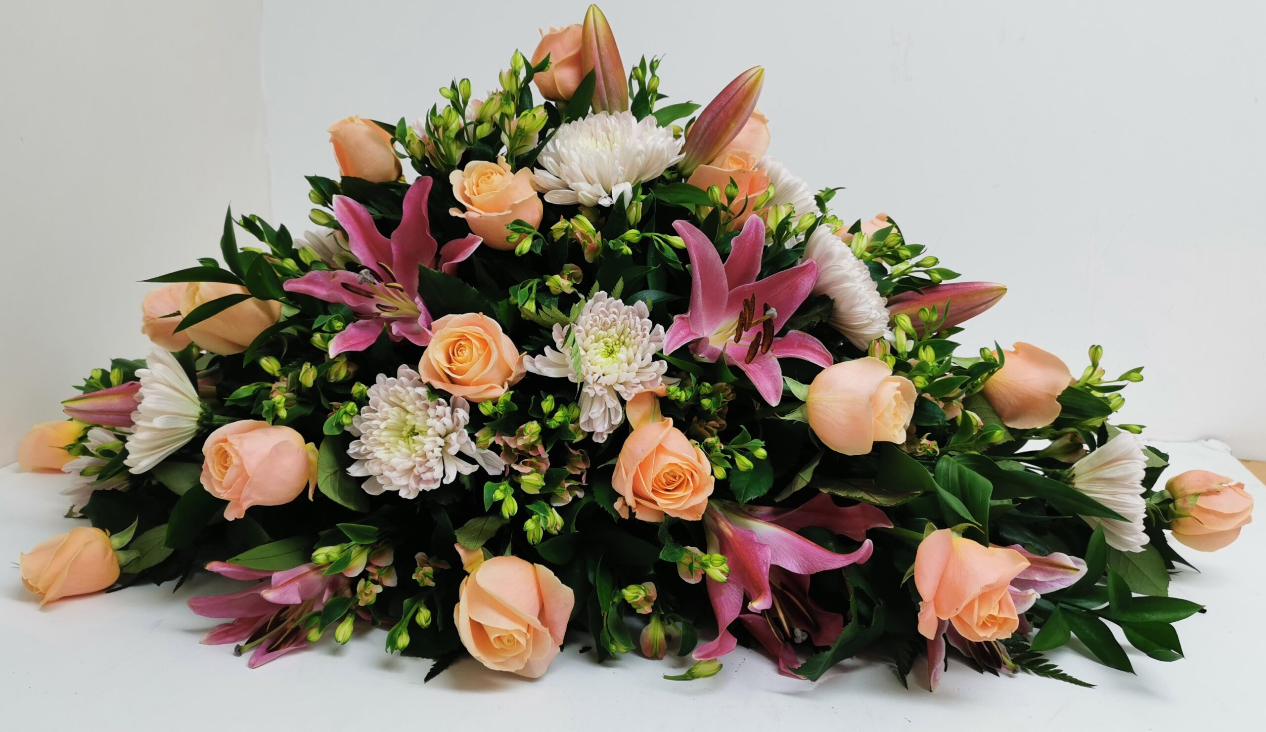 This casket spray has been created using fresh seasonal flowers in soft peach and pink tones. Our professional florist can design and create the personal touch you require, with prices varying depending on your needs for the casket spray.