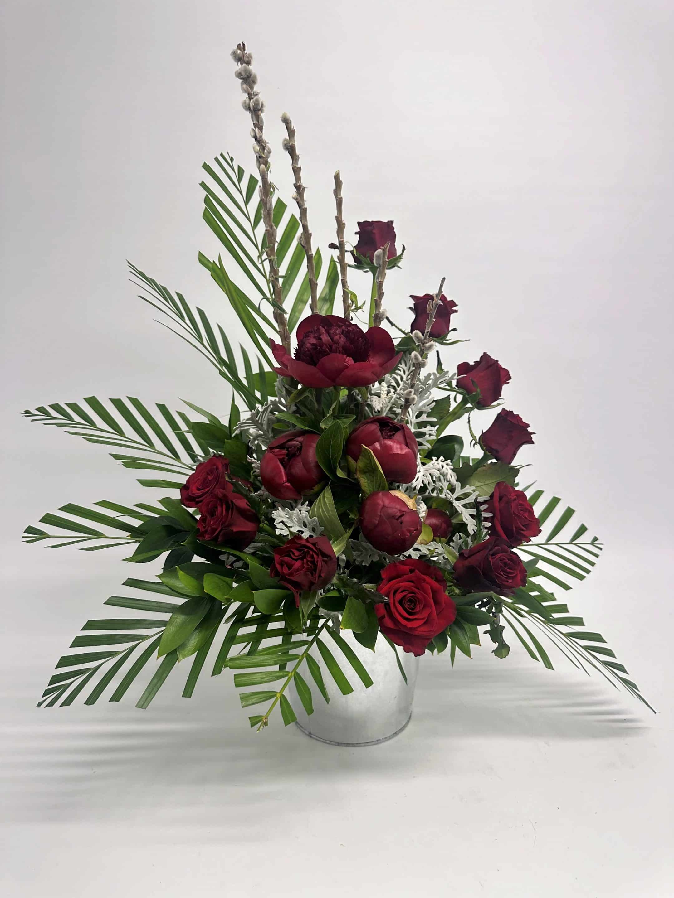 Arranged in a ceramic container with oasis (no vase needed)