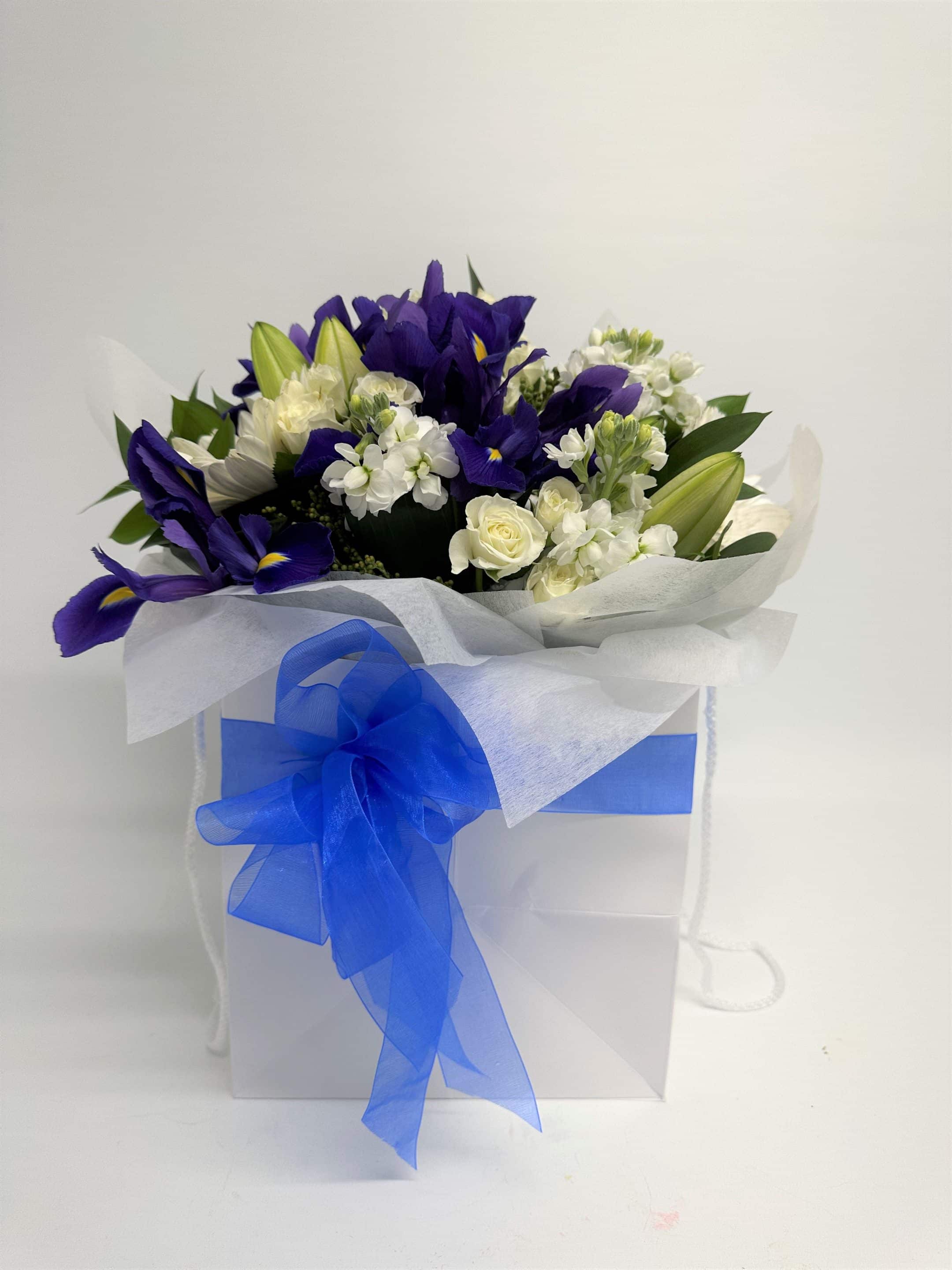 - Cool Blue Iris Poise Bouquet ,full of quantity fresh flowers , selection of white and blue flowers, arranged in a posy presentation style and wrapped by our professional designer .Delivered in a white bag in a container of water great for hospitals or Bereavements