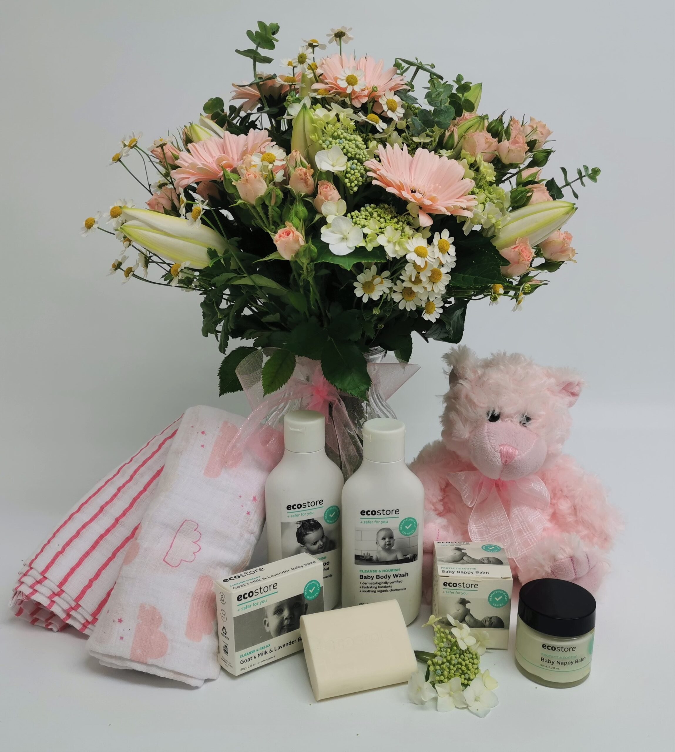 Welcome a beautiful baby girl with our lovingly curated Gift Basket & Baby Girl Bouquet Hamper, designed to spoil both mum and baby. This special gift set features a pastel pink seasonal flower bouquet arranged in a glass vase, paired with premium baby essentials and a soft pink teddy bear — the perfect newborn celebration gift.