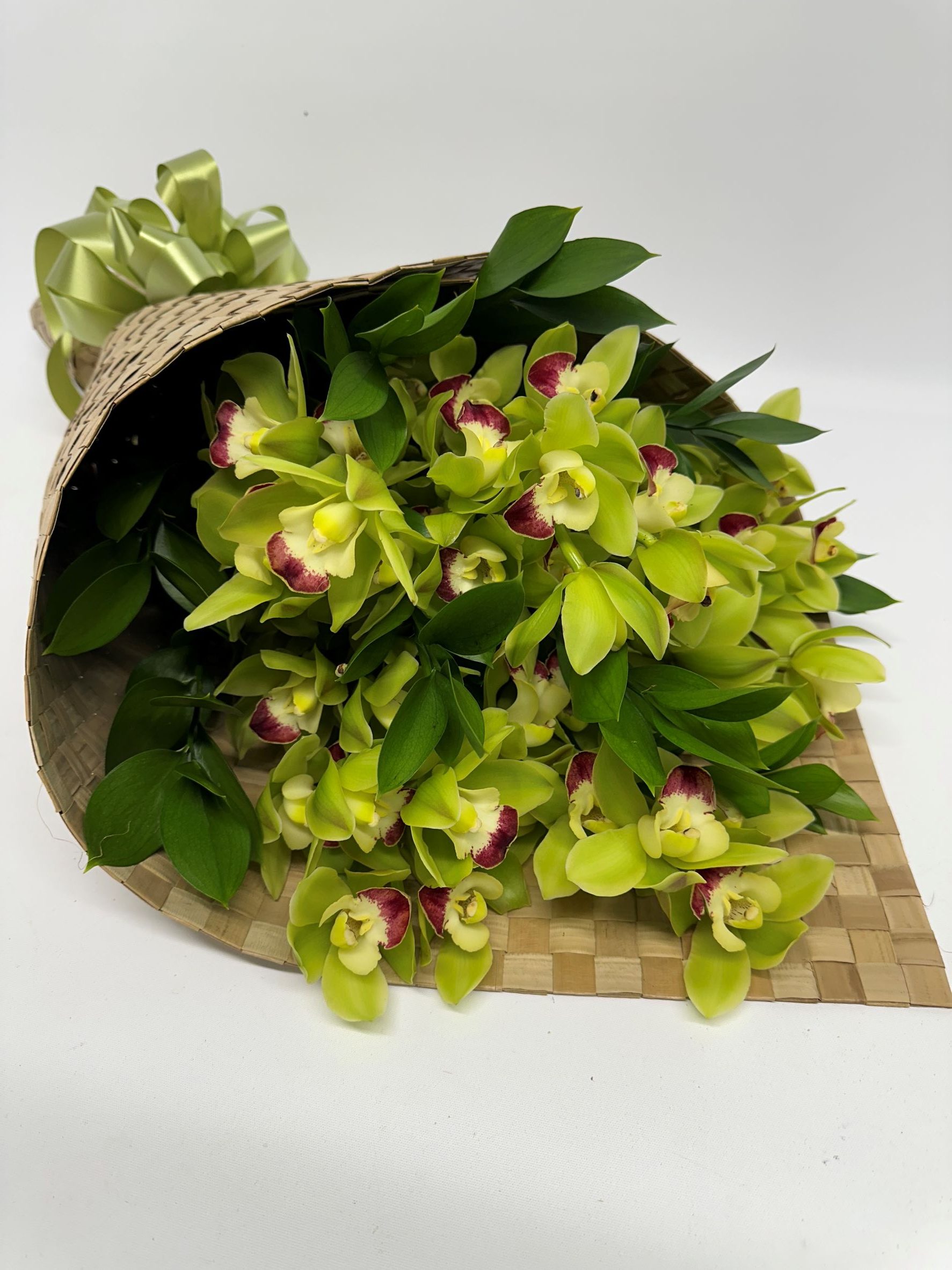 Green Orchids Bouquet are wrapped in a flax wrap and arranged in a presentation style with green bow,a very long lasting seasonal flower