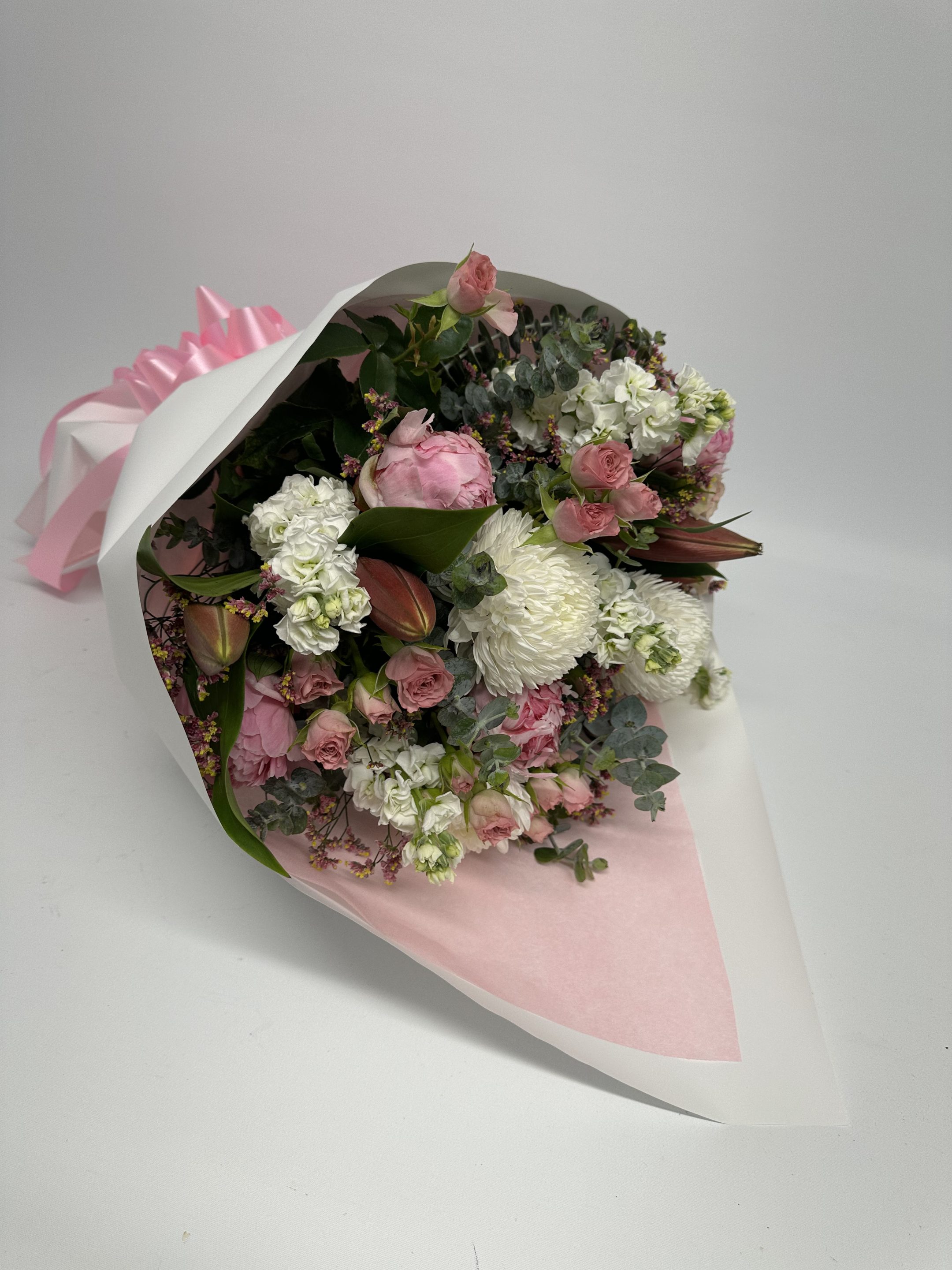 The Pink Beauty Bouquet is a timeless arrangement designed with a gorgeous selection of fresh seasonal flowers in soft pink and white tones. Each bloom is delivered in bud for maximum freshness and longevity, then handcrafted in a classic posy presentation style by our professional floral designers. Beautifully wrapped in elegant white paper, this bouquet is perfect for any occasion where gentle beauty and refinement are appreciated.
