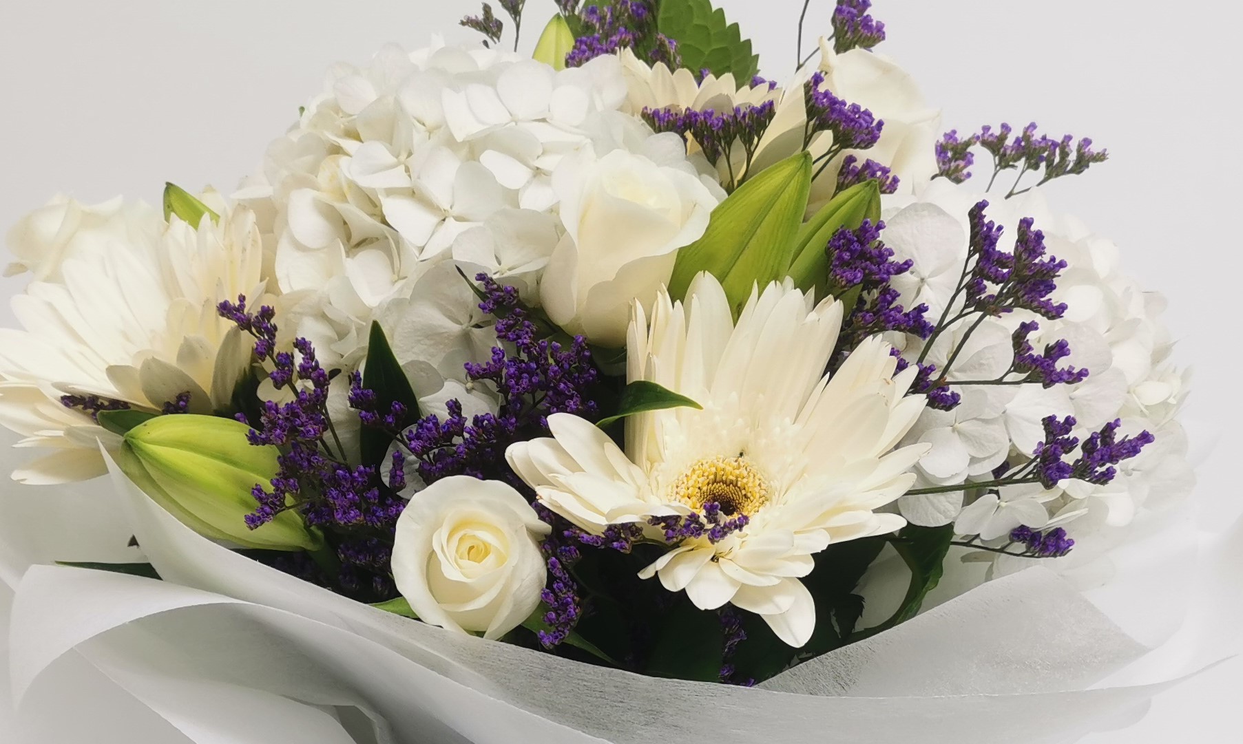 Fresh seasonal mix of White Stock, White Lilies, Iris, and Gerberas
