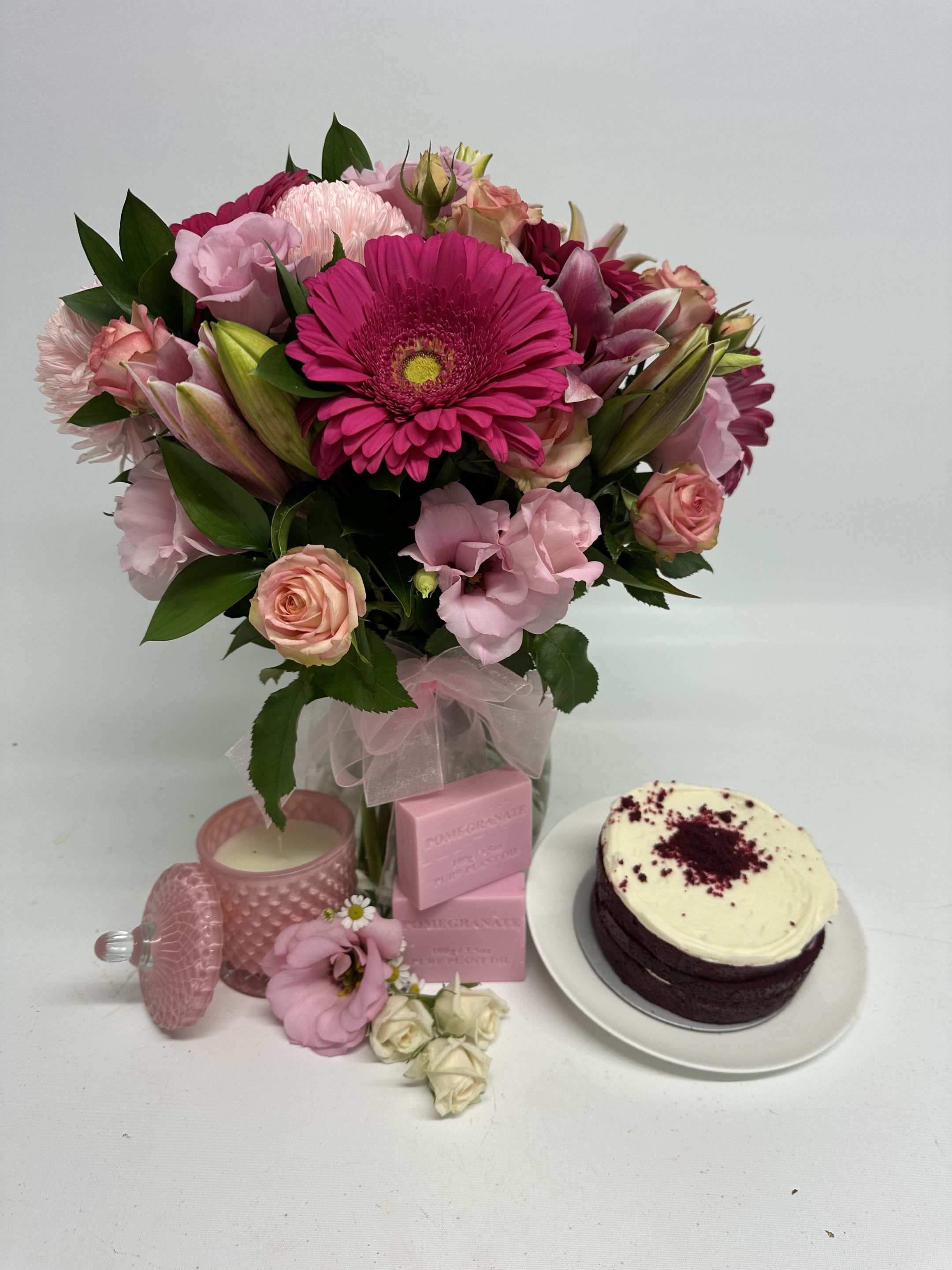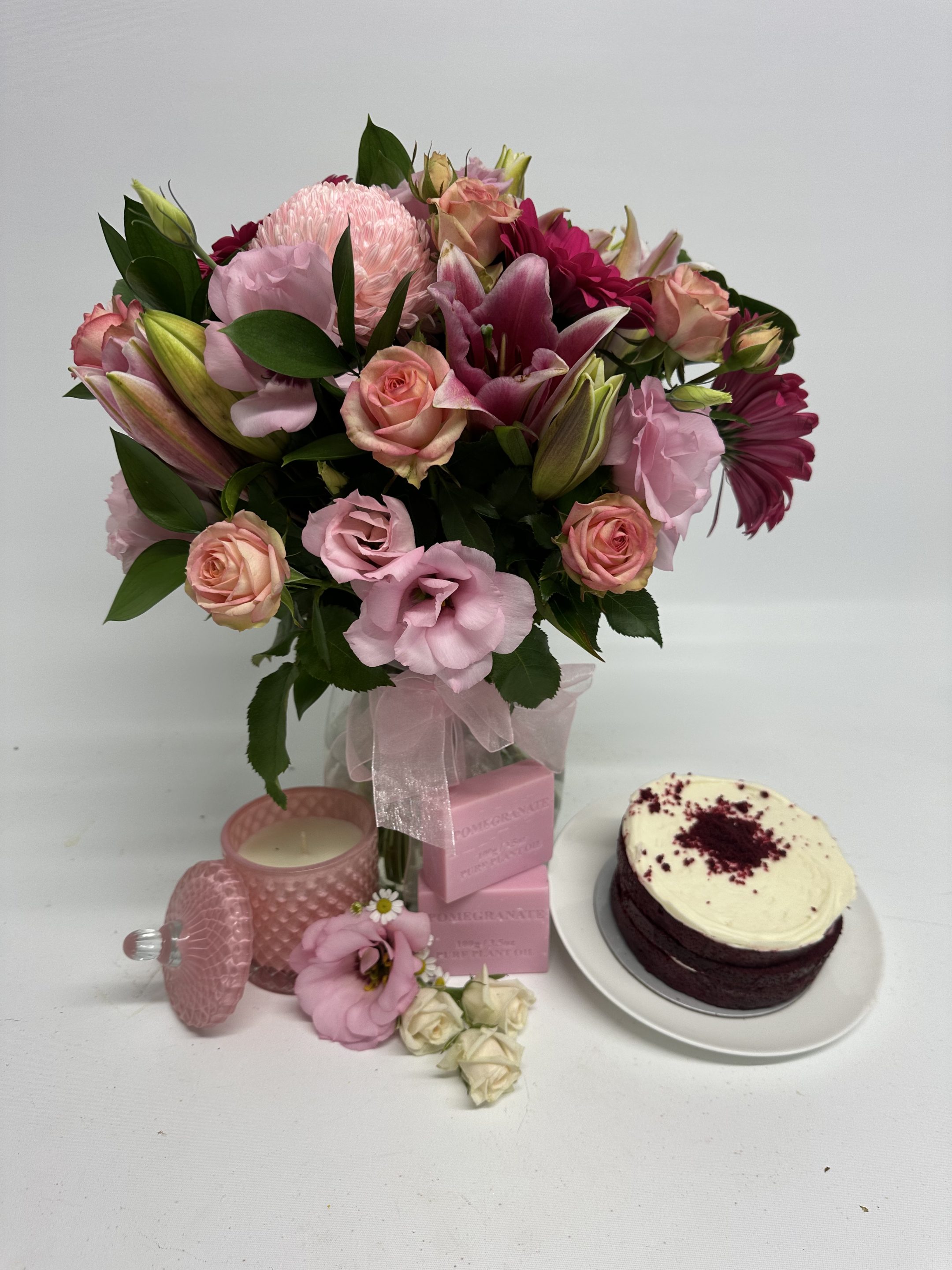 This luxurious set also includes a Red Velvet cake, an Lotus scented candle 108g /25 hours burn time, and two handmade soaps, creating a thoughtful and indulgent gift for any occasion.