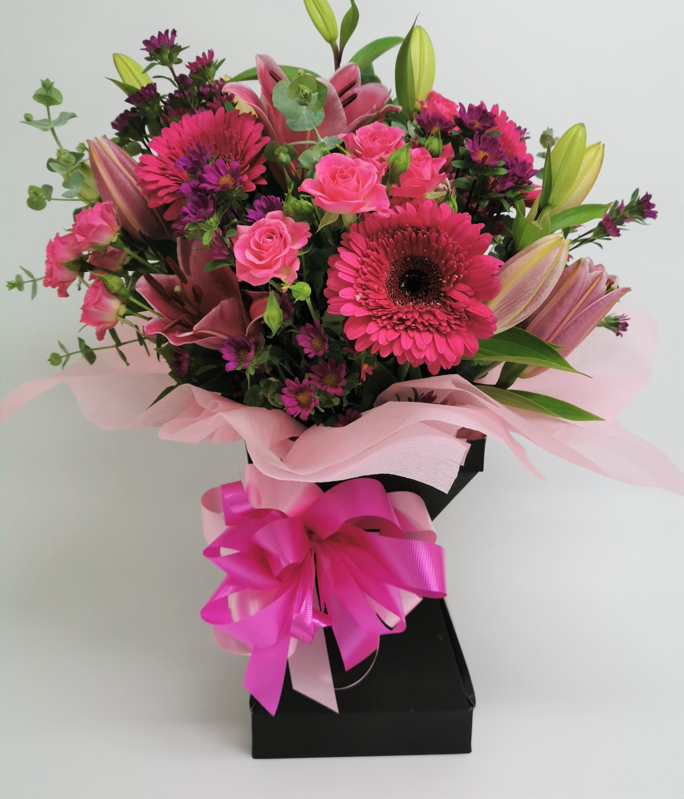 Brighten someone’s day with this vibrant pink bouquet, created using the freshest seasonal flowers in a beautiful mix of colours and textures. Arranged and delivered in a convenient water vox, it’s a perfect choice for Mum or anyone who deserves a cheerful surprise.