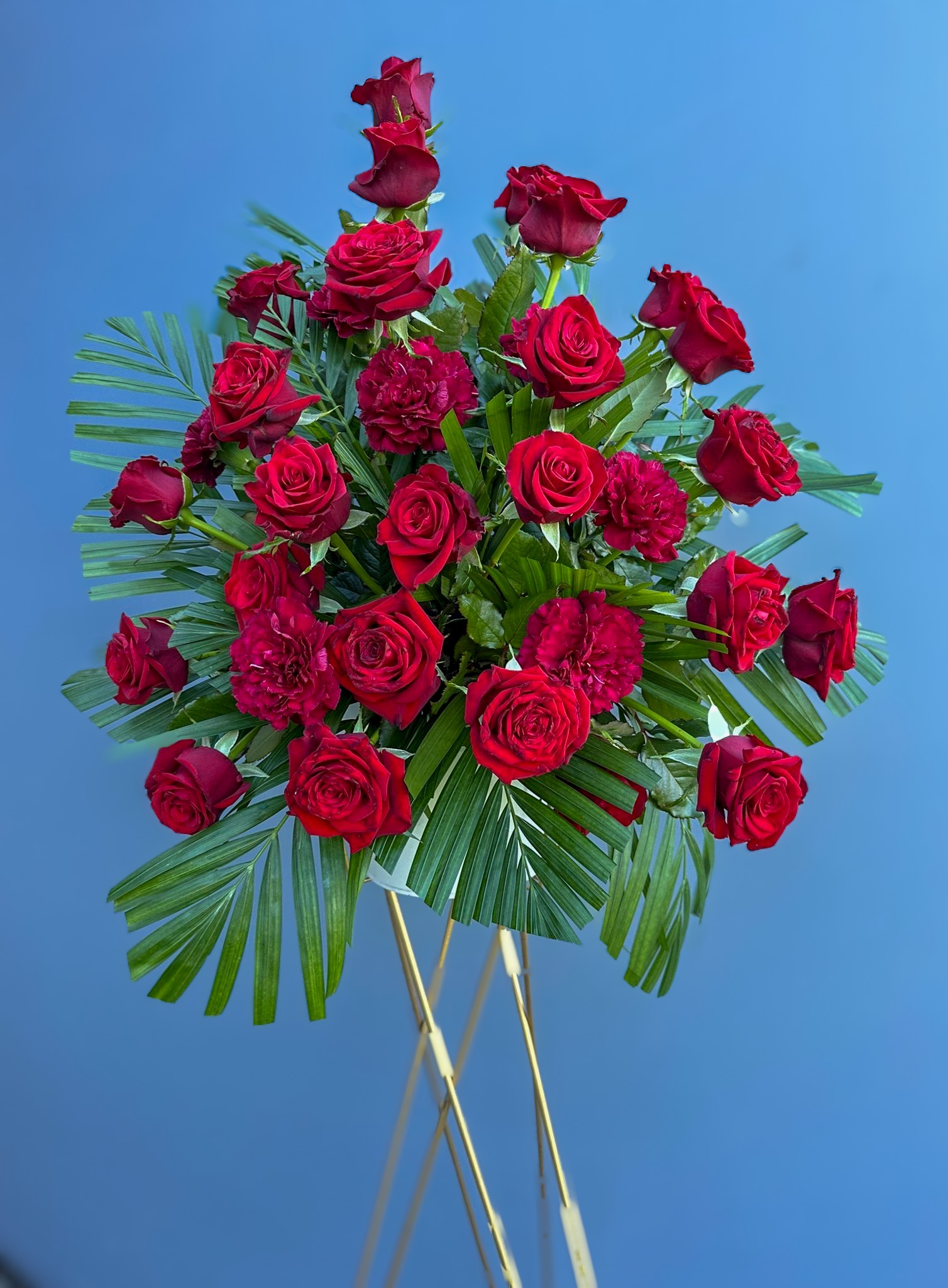 A serene and elegant sympathy arrangement created in red tones, arranged in oasis and presented on a stand. Ideal for churches, funeral services, memorials, or farewell gatherings — a respectful tribute to honour a loved one.━━━━━━━━━━━━━━━━━━━━━━━━━━━━━━━━━━