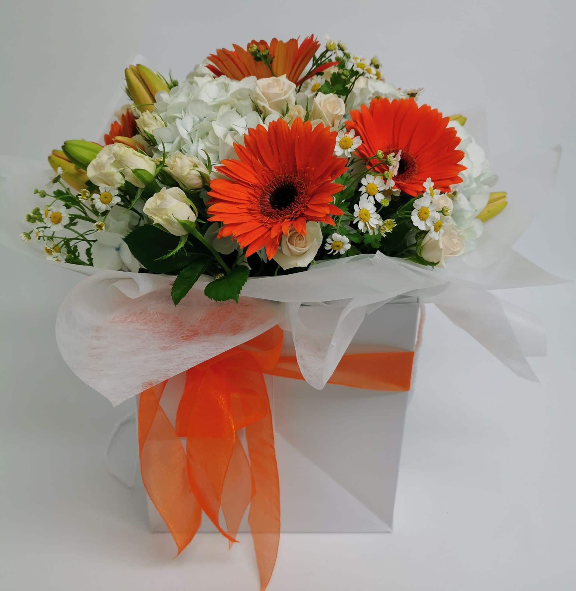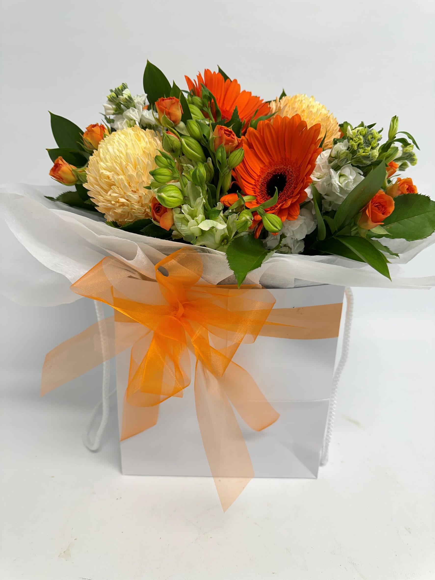 Bright, vibrant, and full of cheerful energy — the Orange Zest Bouquet features a beautiful selection of cream and orange-toned fresh seasonal flowers. This striking arrangement includes roses, lilies, gerberas, and white stock, all expertly crafted in a classic posy presentation style. Wrapped by our professional floral designer and delivered in a white carry bag with a water-filled container, it’s a perfect choice for any uplifting occasion.