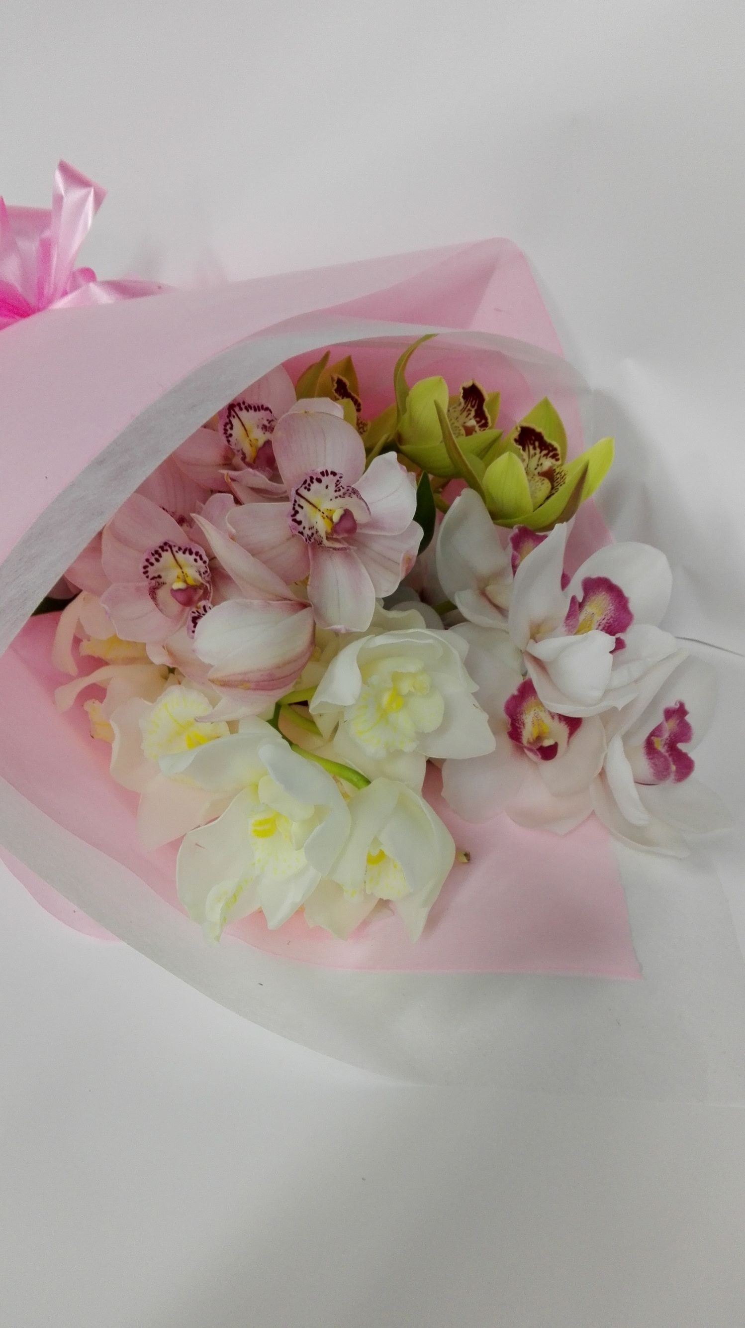 Large Stems of Orchids are wrapped in a soft pink and white colours wrap and arranged in a presentation style with soft pink bow,a great long lasting seasonal flower