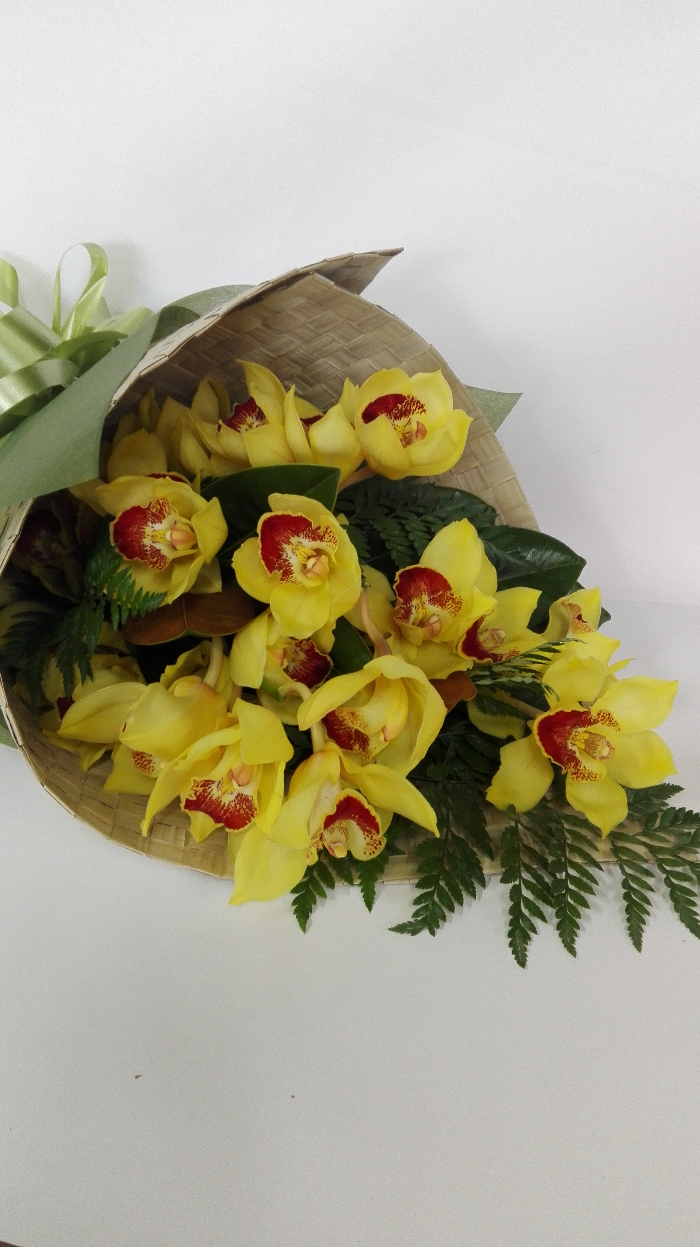 Orchids are wrapped in a flax wrap arranged in a presentation style ,great long lasting seasonal flower. Colours may differ depending on stock.