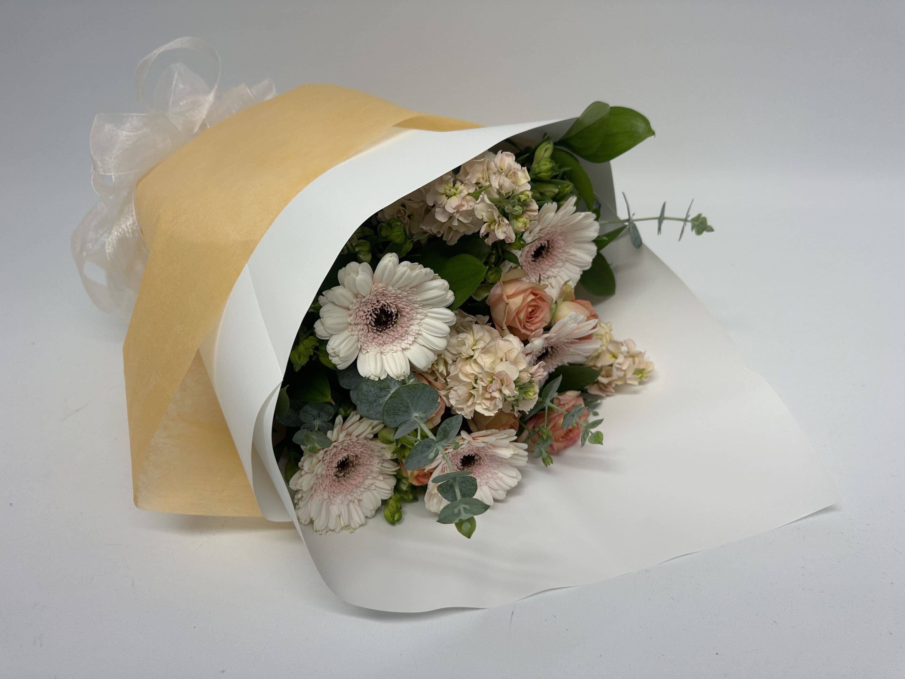 A soft and elegant selection of premium peach-toned seasonal flowers, our Peach Petite Bouquet is beautifully arranged in a classic posy presentation style. Each bouquet is handcrafted by our professional floral designer and wrapped in crisp white paper for a refined, stylish finish.