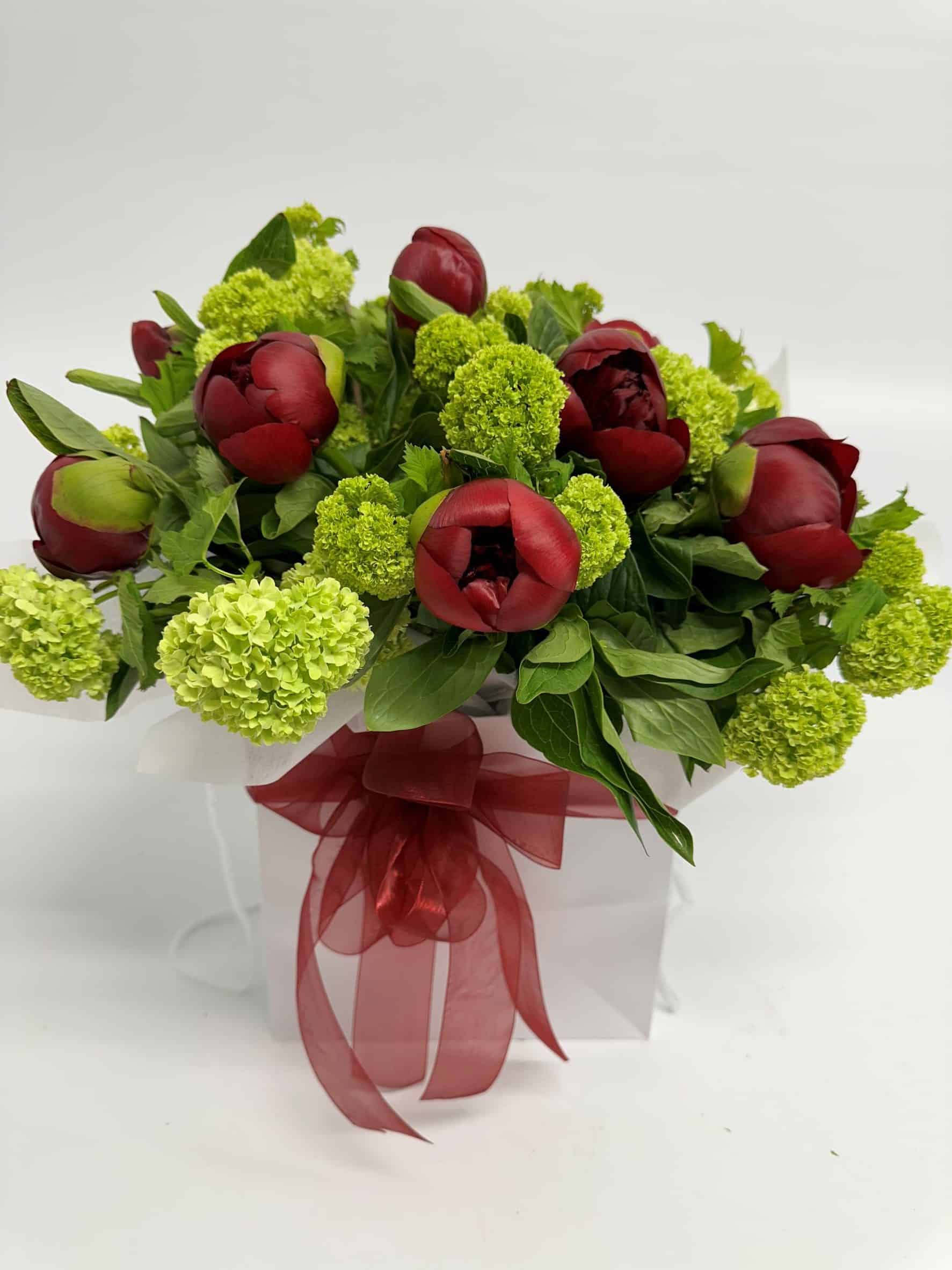 PEONIES/PEONY ROSE -RED CHARM in a bouquet arranged with seasonal greenery wrapped in white paper with a wet wrap to keep flowers fresh on delivery,the Peony are grown in the South Island of New Zealand only ,with it’s gorgeous lush bloom and delicate scent, so very special and an absolute favorite flower to many due to their short season.