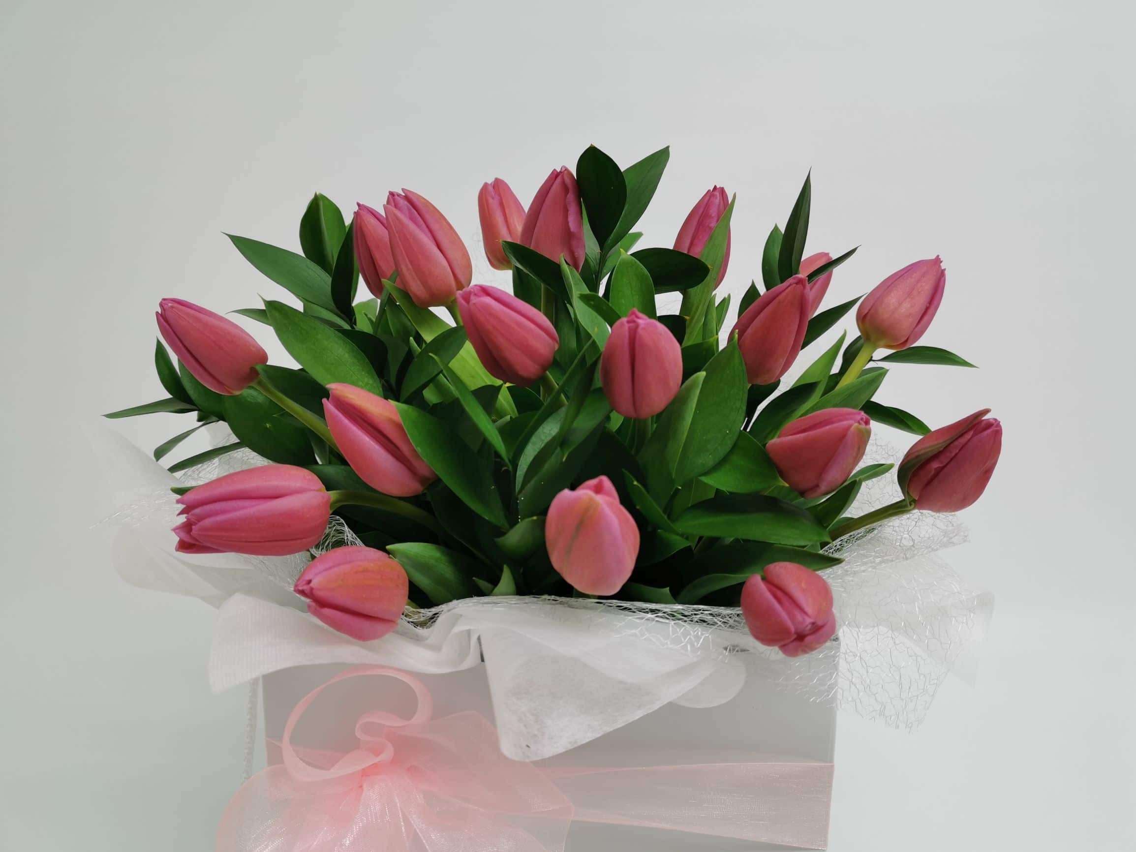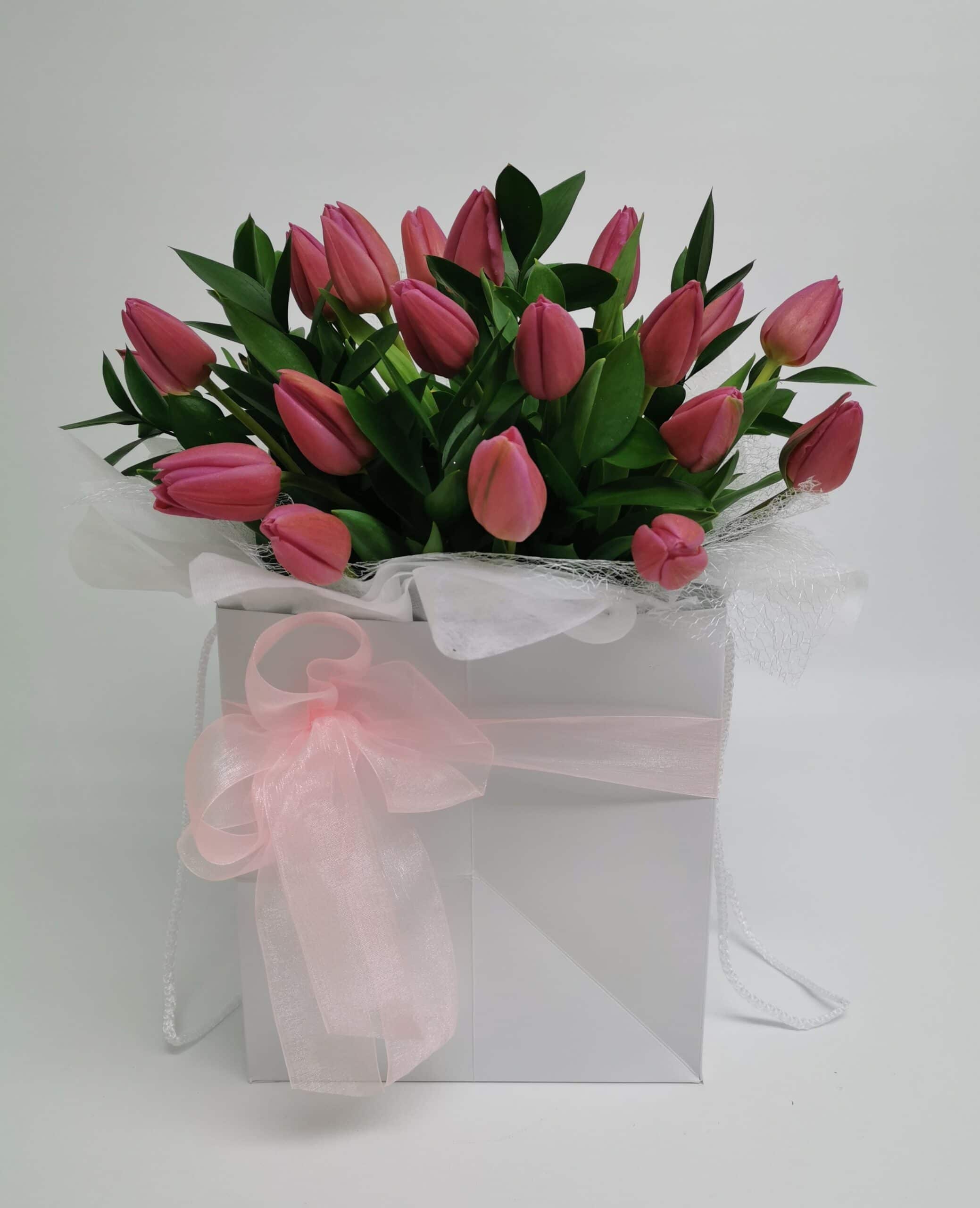 Send something beautifully unique with this stunning bouquet of 20 fresh pink tulips. These special seasonal flowers are delivered in bud form so they last longer and can be enjoyed for days to come. Arranged in a classic posy style and presented in a white carry bag with a water container to keep the flowers fresh.