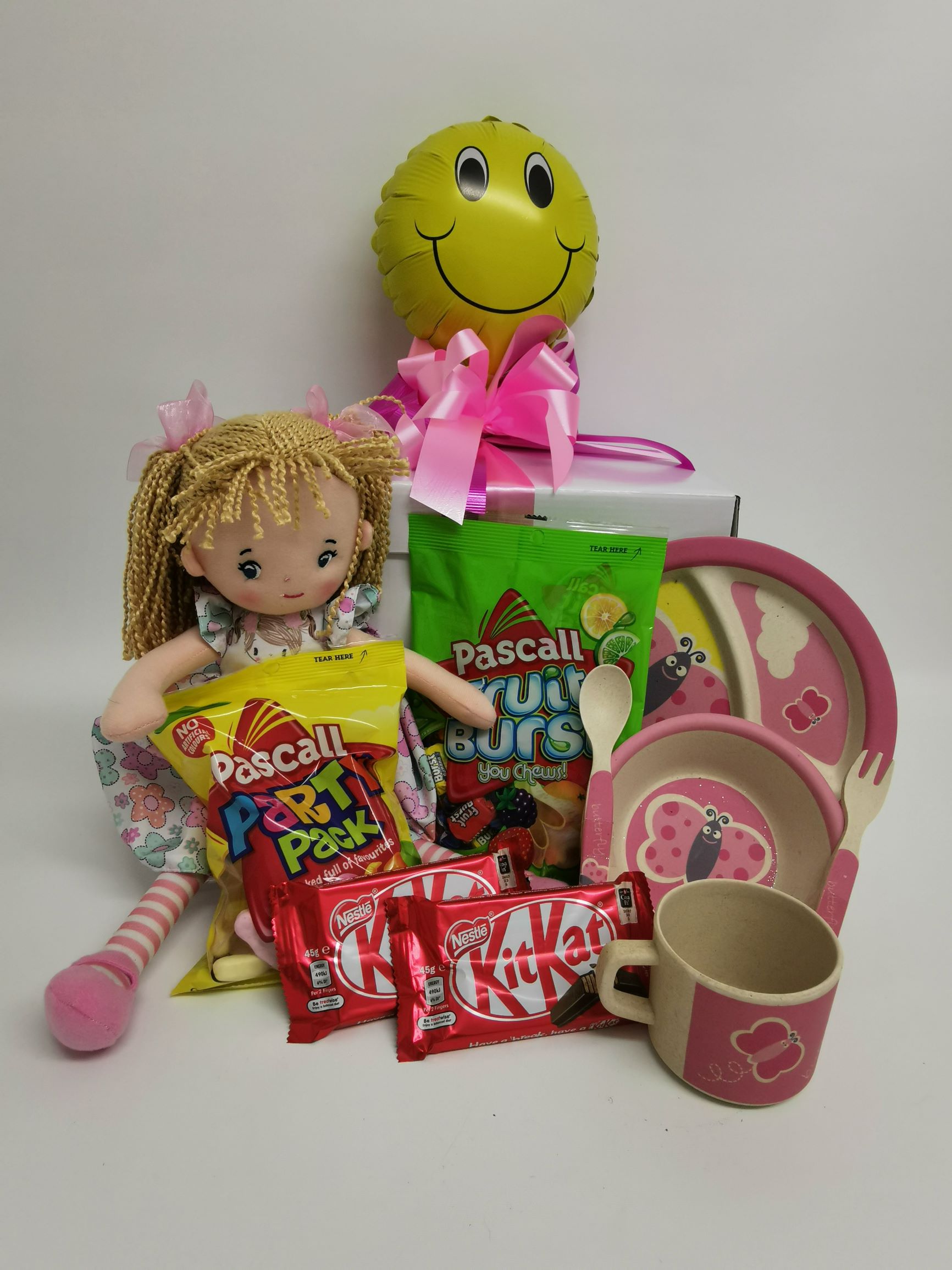 The perfect cheerful surprise for a young child, our Pinkie Children’s Picnic Hamper is designed to brighten their day — whether they’re at home, recovering in hospital, or celebrating a special occasion. This charming hamper includes a playful picnic-style set, sweet treats, and a soft pink doll, all beautifully arranged in a gift box with decorative trims.