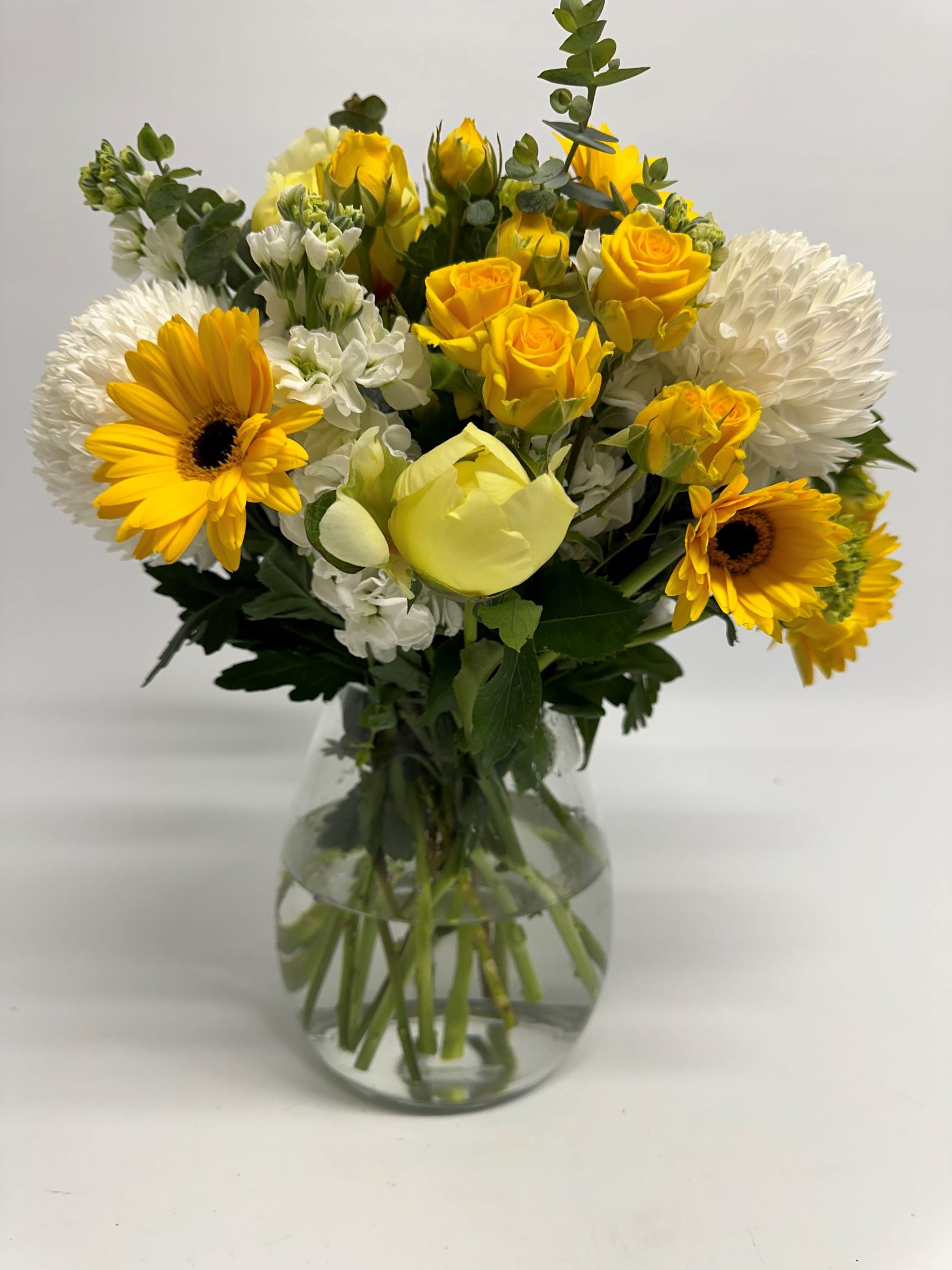 • Bright, warm, and full of joy — our Yellow Tones Flowers in a Glass Vase features a beautiful selection of premium seasonal flowers in cheerful yellow, crisp white, and fresh green tones. Each bloom is delivered in bud form for maximum freshness, value, and longer-lasting enjoyment. Designed in a classic posy style and professionally arranged, this bouquet is presented in a stylish glass vase, ready to display and enjoy.
