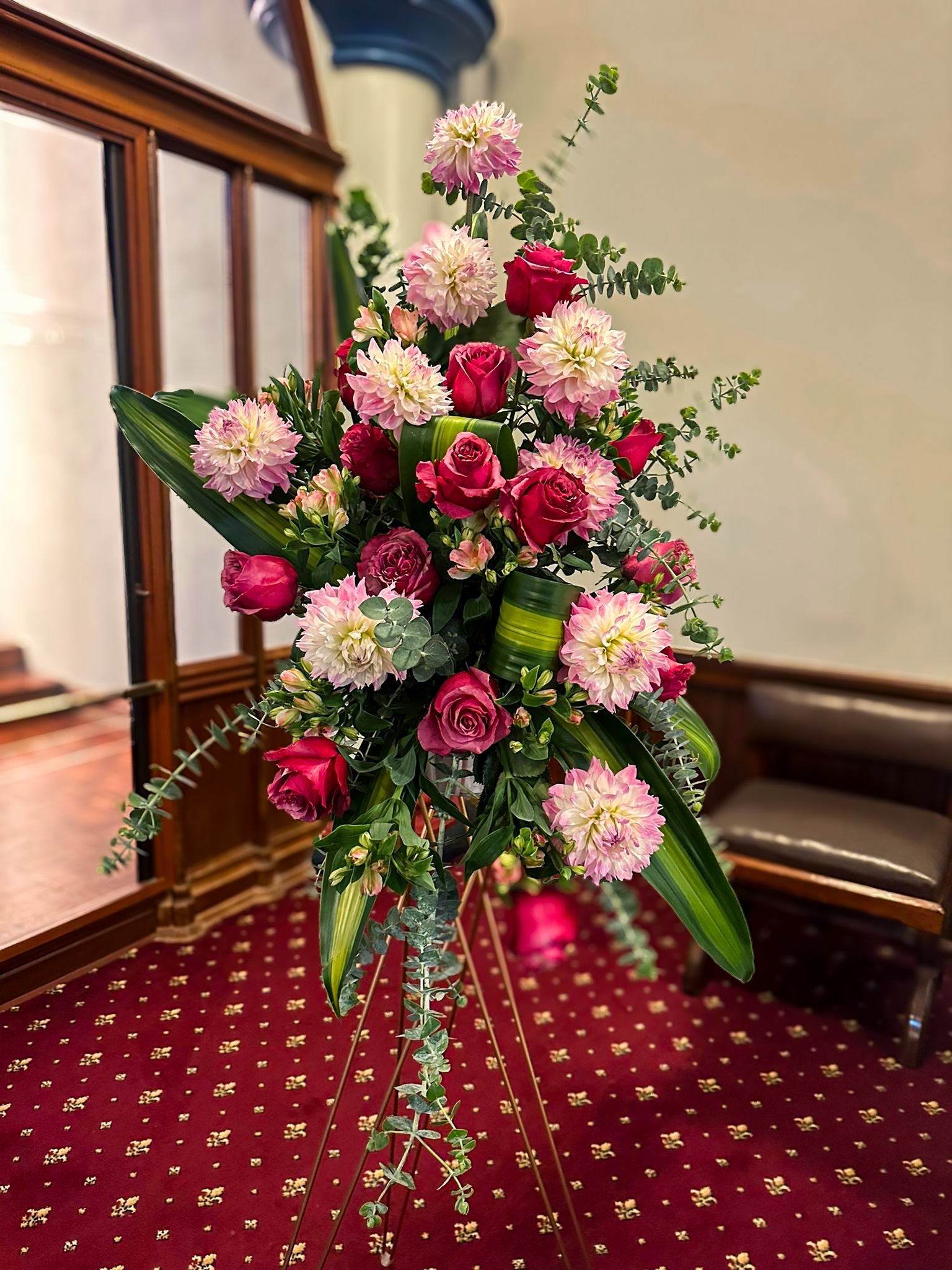 A serene and elegant sympathy arrangement created in fresh soft pink tones, arranged in oasis and presented on a stand. Ideal for churches, funeral services, memorials, or farewell gatherings — a respectful tribute to honour a loved one.━━━━━━━━━━━━━━━━━━━━━━━━━━━━━━━━━━