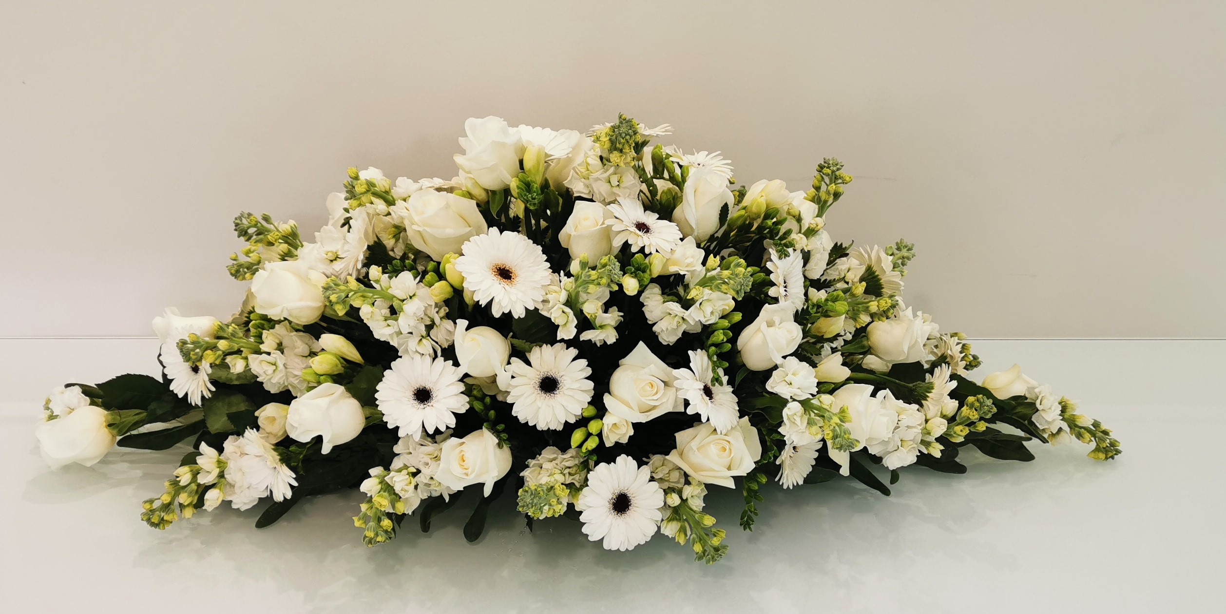 This sympathy casket spray is created with fresh seasonal flowers and designed with care by our professional florists. We can tailor the colours and style to suit your personal wishes, with pricing varying depending on the size and requirements of your chosen casket spray.