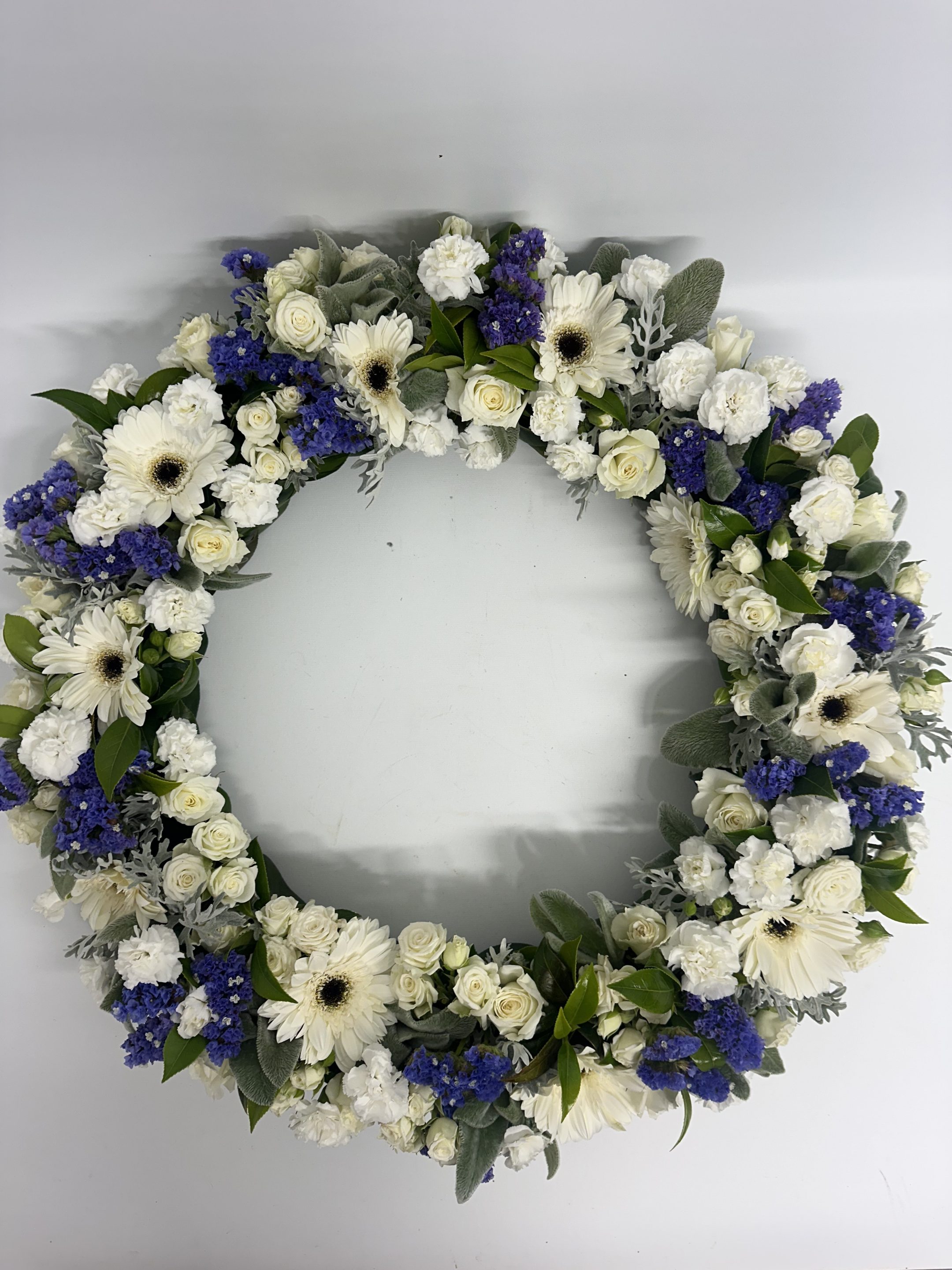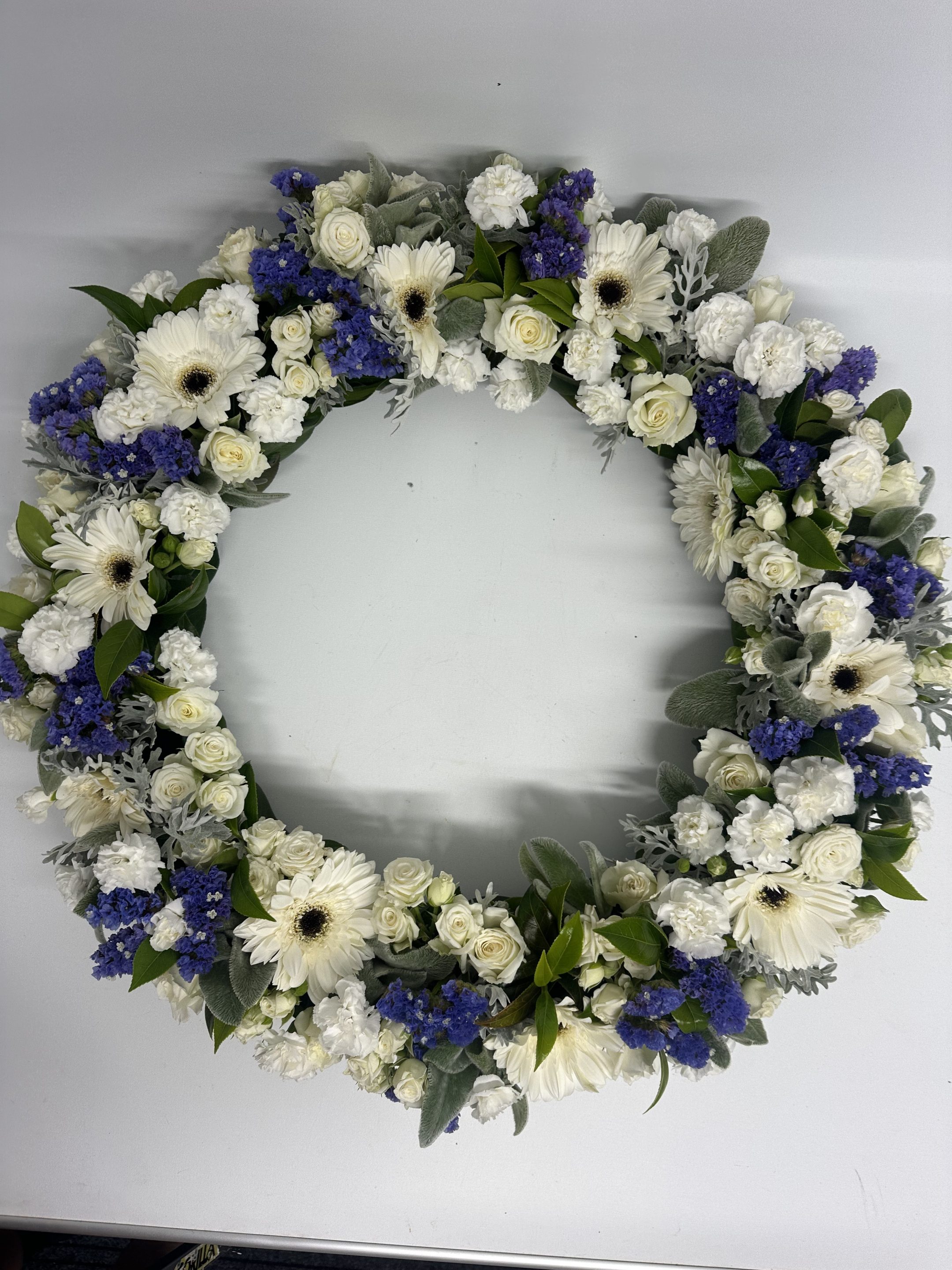 This Blue and White Sympathy Wreath is designed with a beautiful selection of fresh seasonal flowers, thoughtfully arranged by our professional florist. A serene and elegant tribute suitable for honouring a loved one.