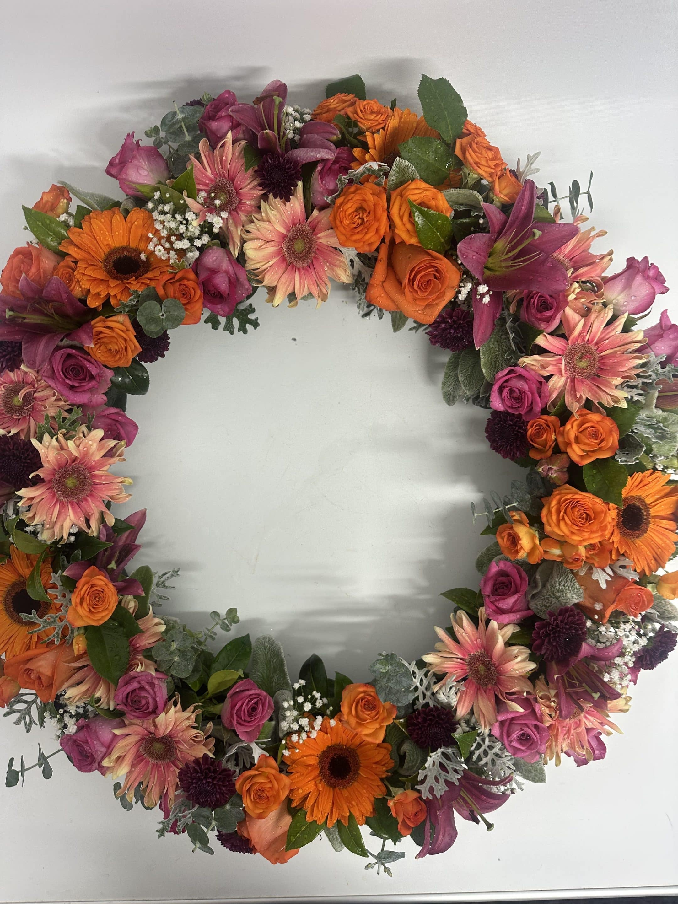 This Sympathy Wreath features rich orange tones and is thoughtfully created by our professional florist using the freshest seasonal flowers delivered in bud to ensure lasting freshness and beauty.