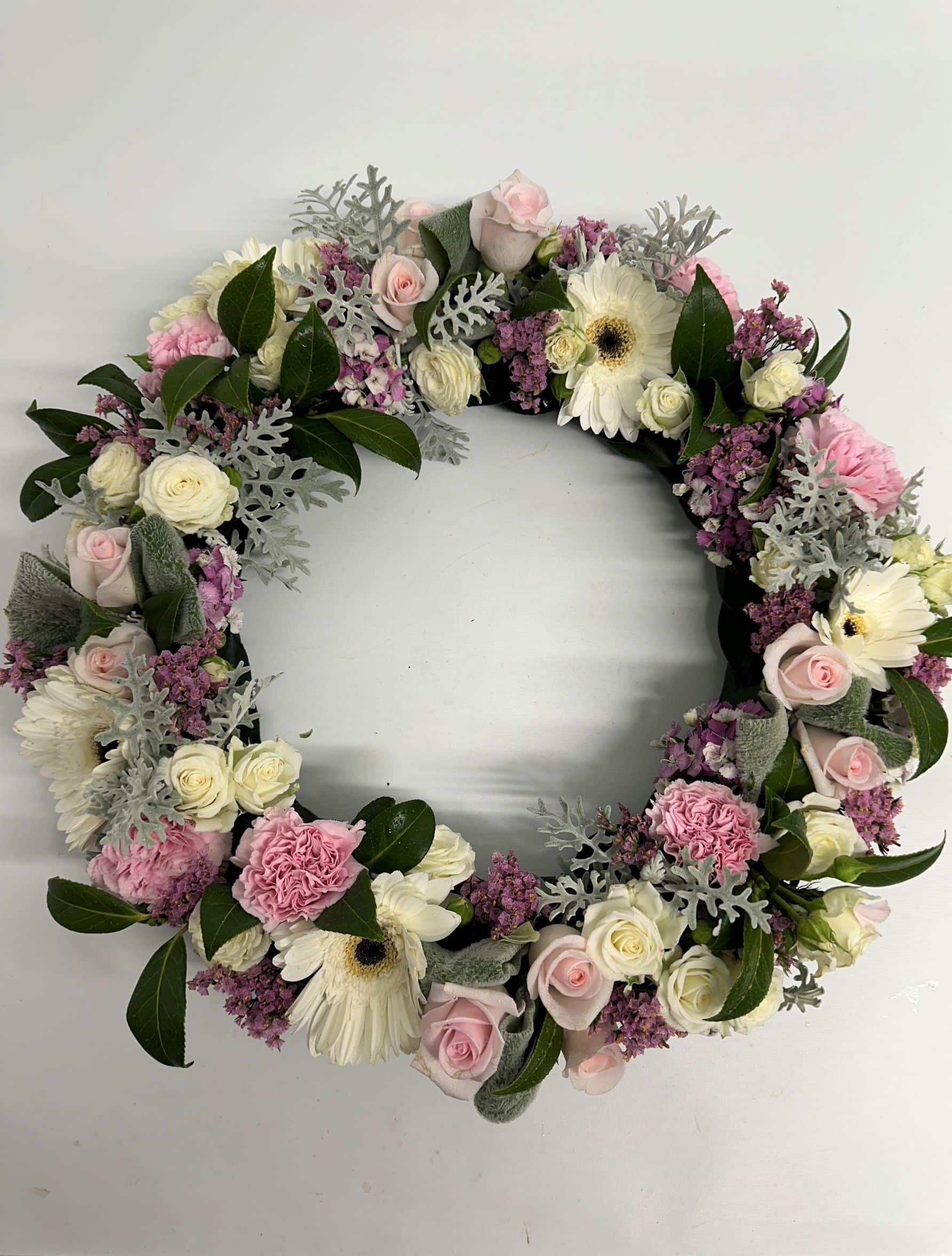 This Pale Pink Wreath features a soft selection of fresh seasonal flowers, beautifully created by our professional florist using blooms delivered in bud to ensure lasting freshness and elegance.