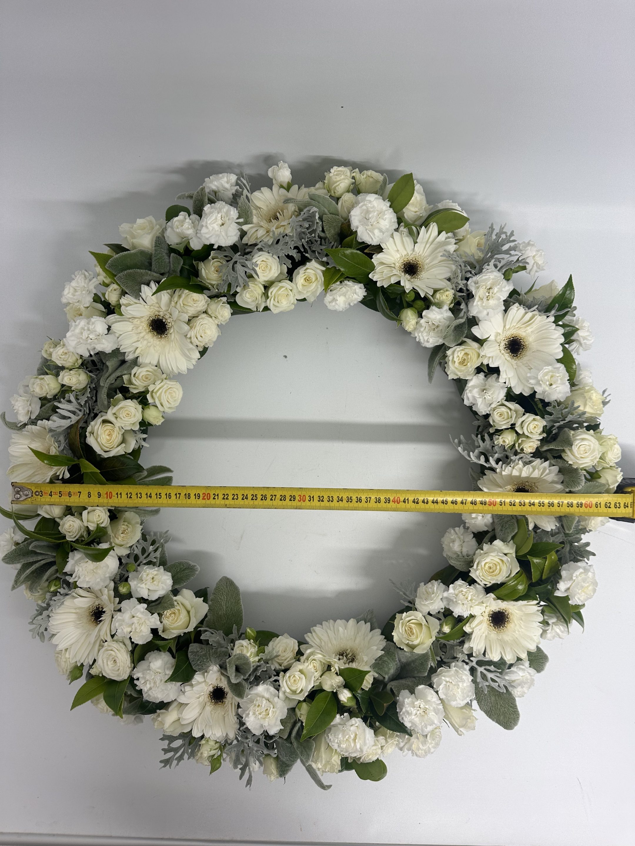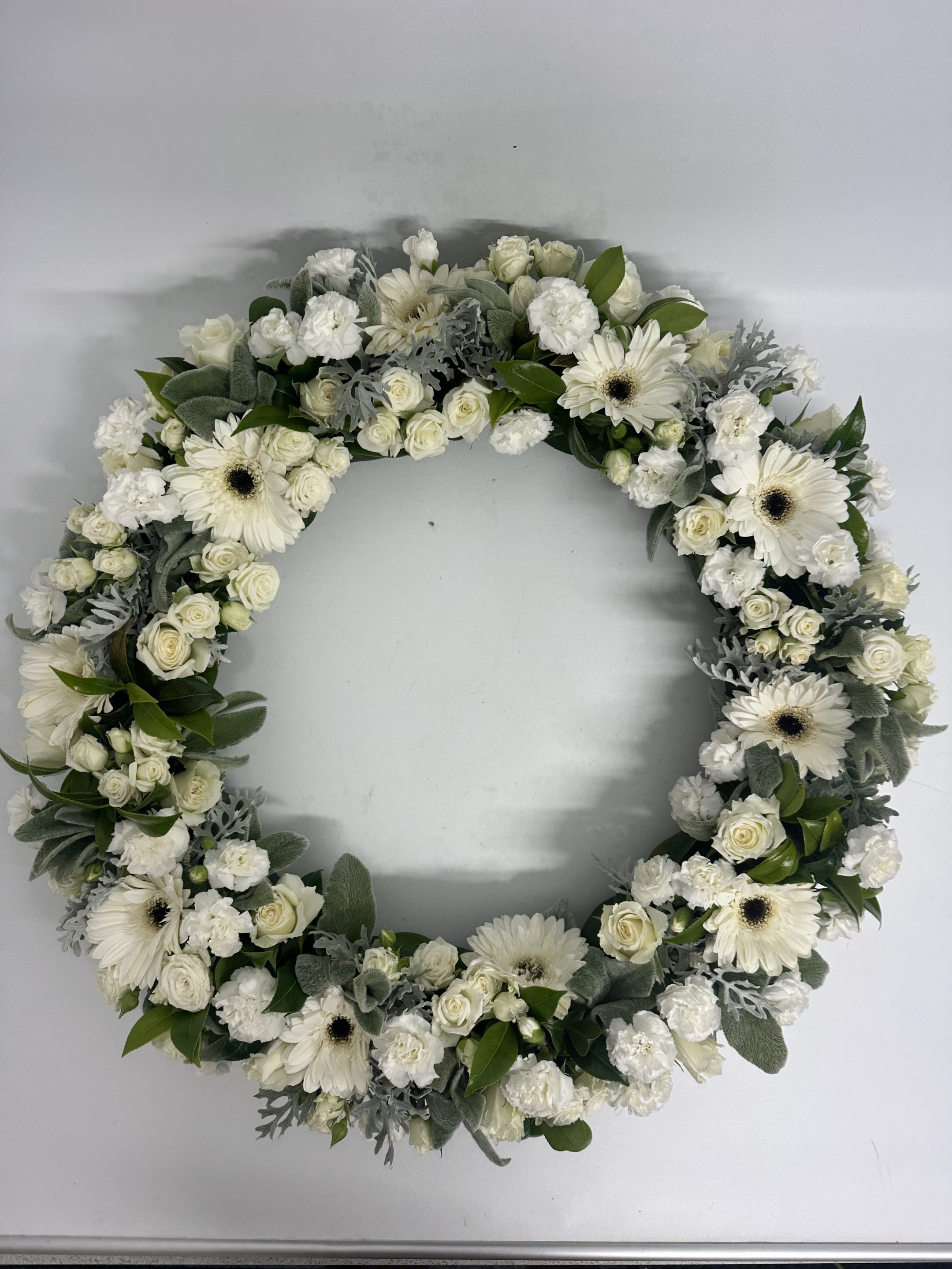 This wreath has been designed using a selection of fresh seasonal flowers in soft white tones, thoughtfully created by our professional florist.