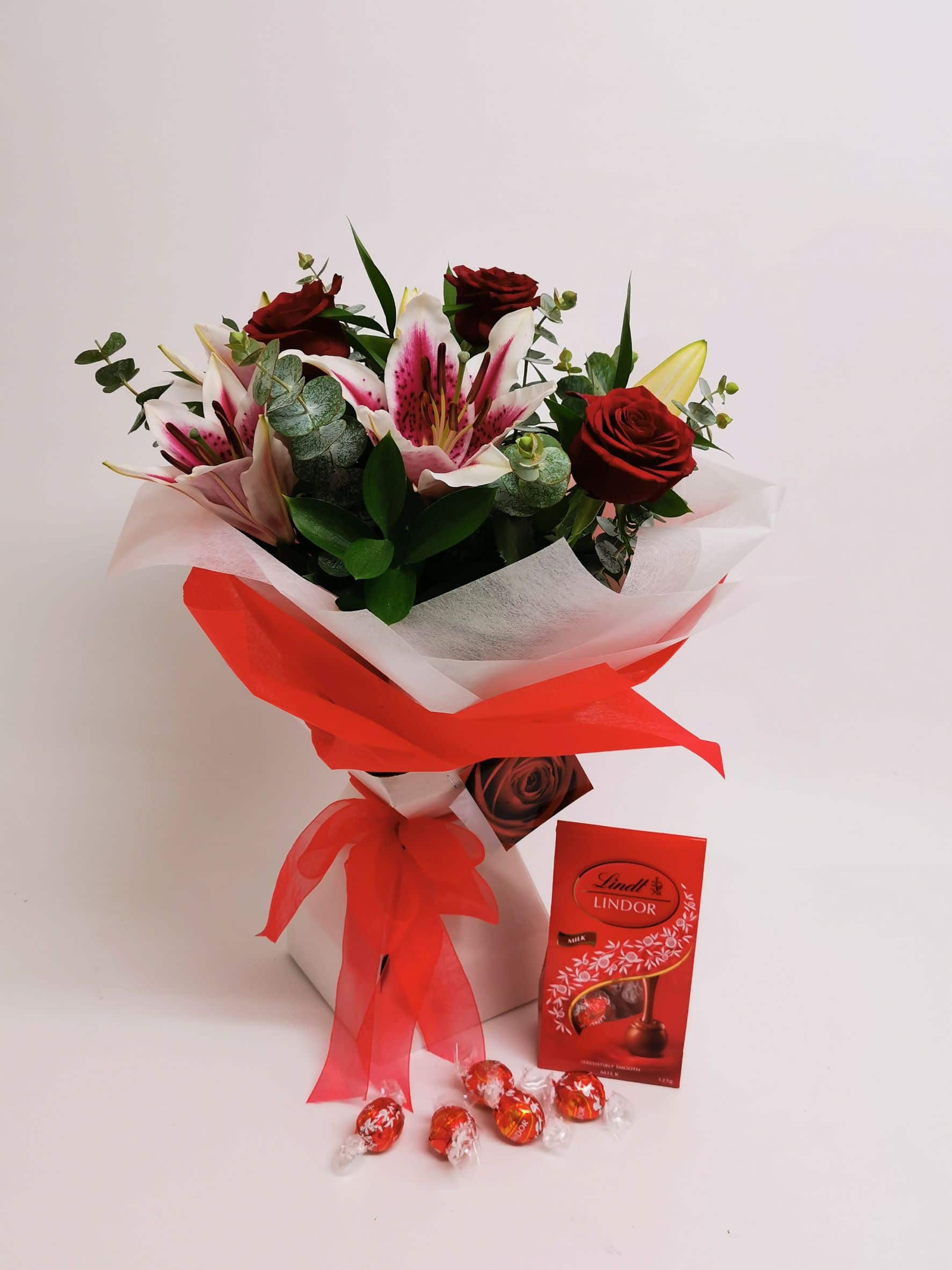 Valentine’s Combo Pink Lilies/ Red Roses/Choc