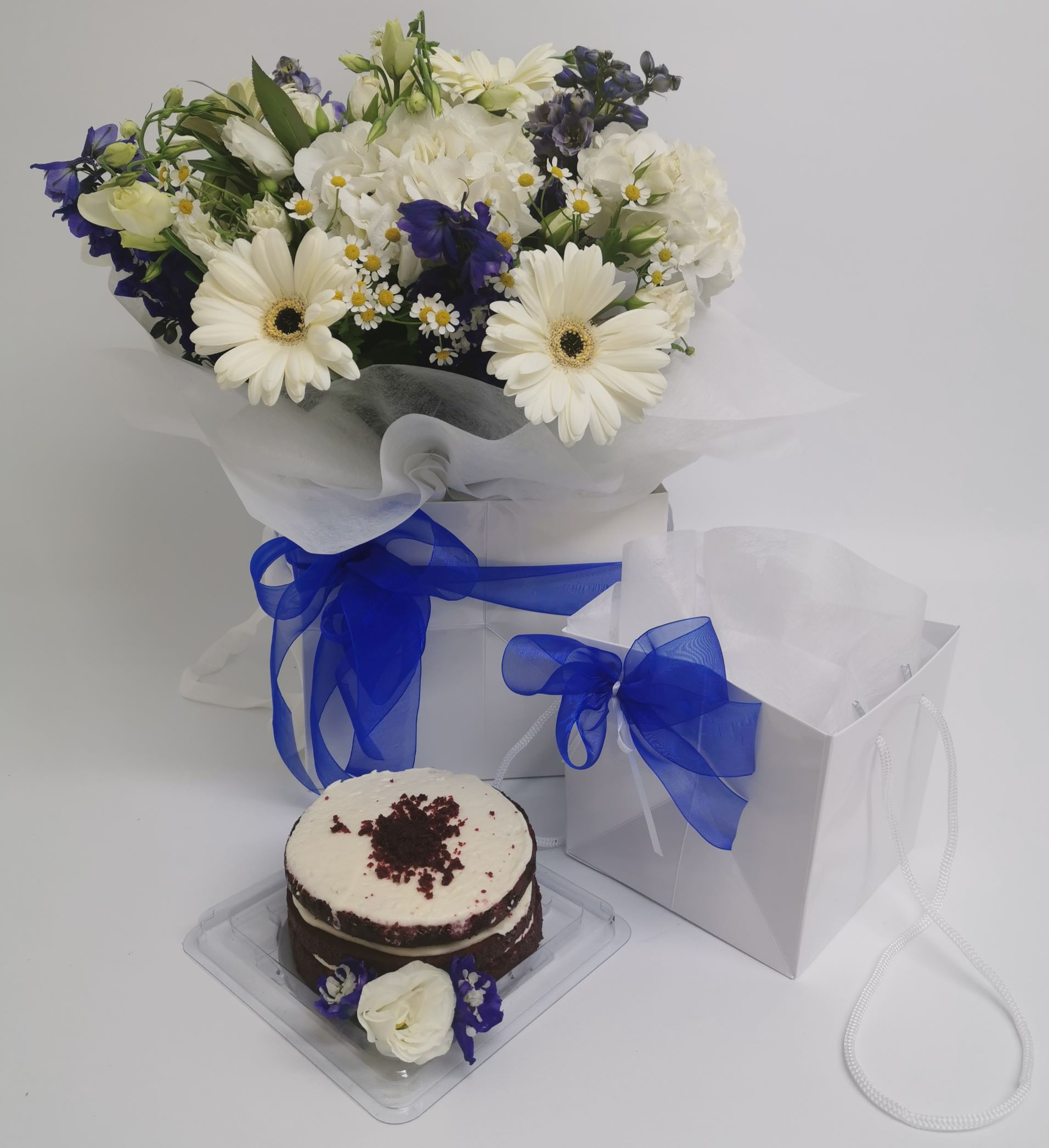 - White/Purple Bouquet & Cake with quality and seasonal flowers white toning fresh flowers in a carry white carry bag with a yummy cake 400g, all flowers delivered in bud so you get value for money, posy presentation style by our professional designer