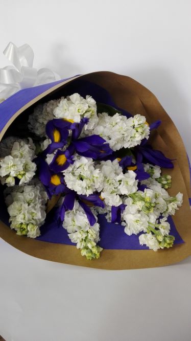 White Stock/Irises Bouquet lovely combination of blue and white ,arranged posy presentation style and wrapped with white paper ,delivered in wet wrap to keep flowers fresh for delivery.