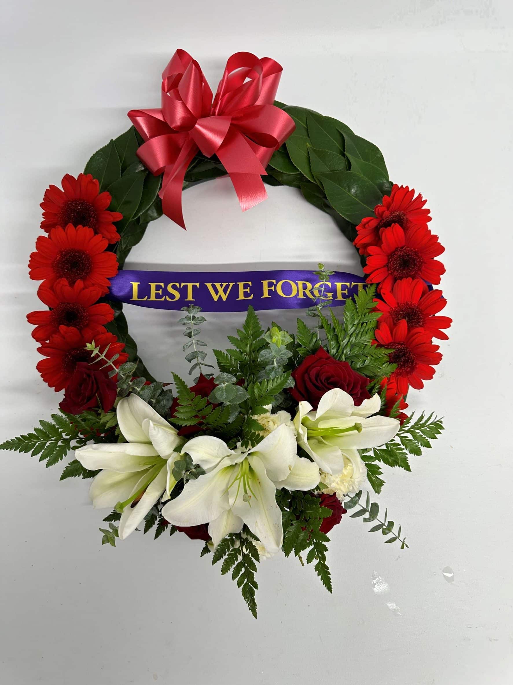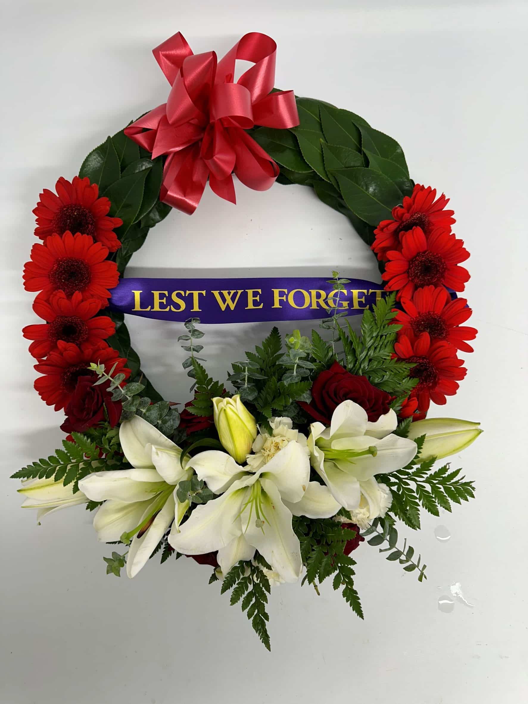 A peaceful ANZAC tribute wreath created with fresh seasonal white and red flowers and finished with a “Lest Not Forget” ribbon. Designed with soft complementary tones, this wreath is a thoughtful way to honour and remember a loved one. Custom designs can also be created to suit your personal tribute.