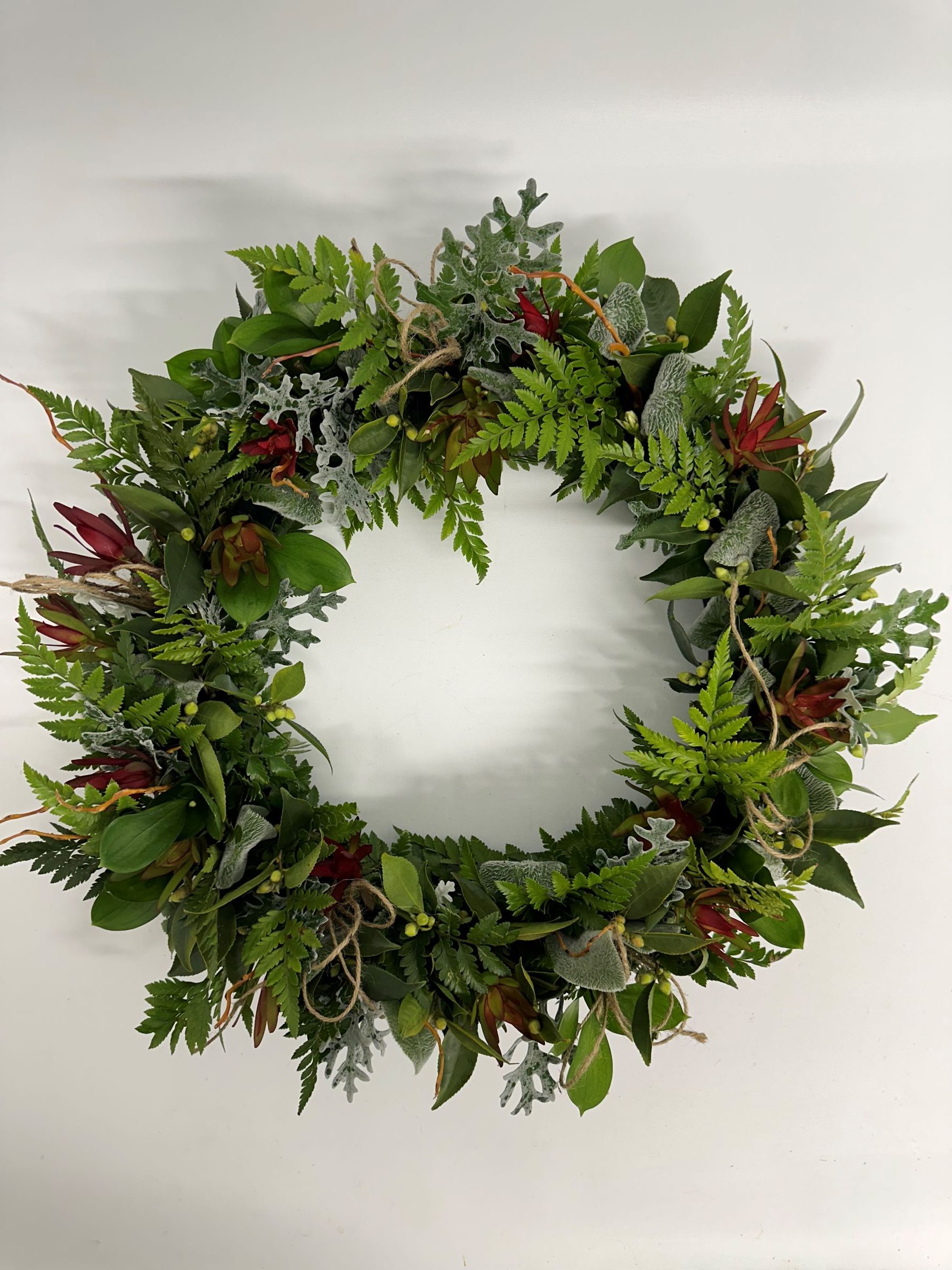 Due to the seasonal availability of greenery, the varieties may differ. Your wreath will always reflect the same style, colour palette, and value.