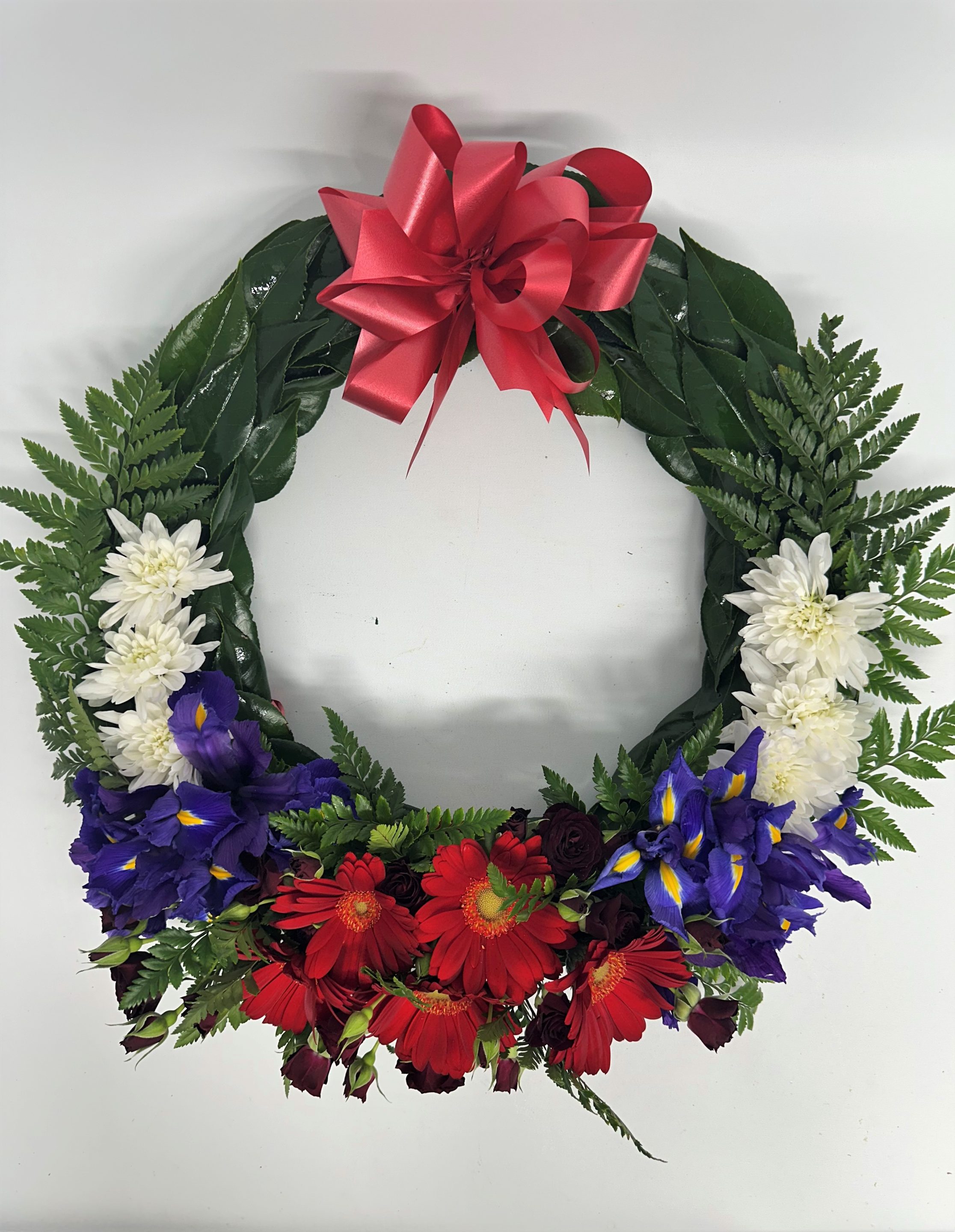 This wreath has been created using a selection of fresh seasonal flowers and fern, thoughtfully arranged by our professional florist.